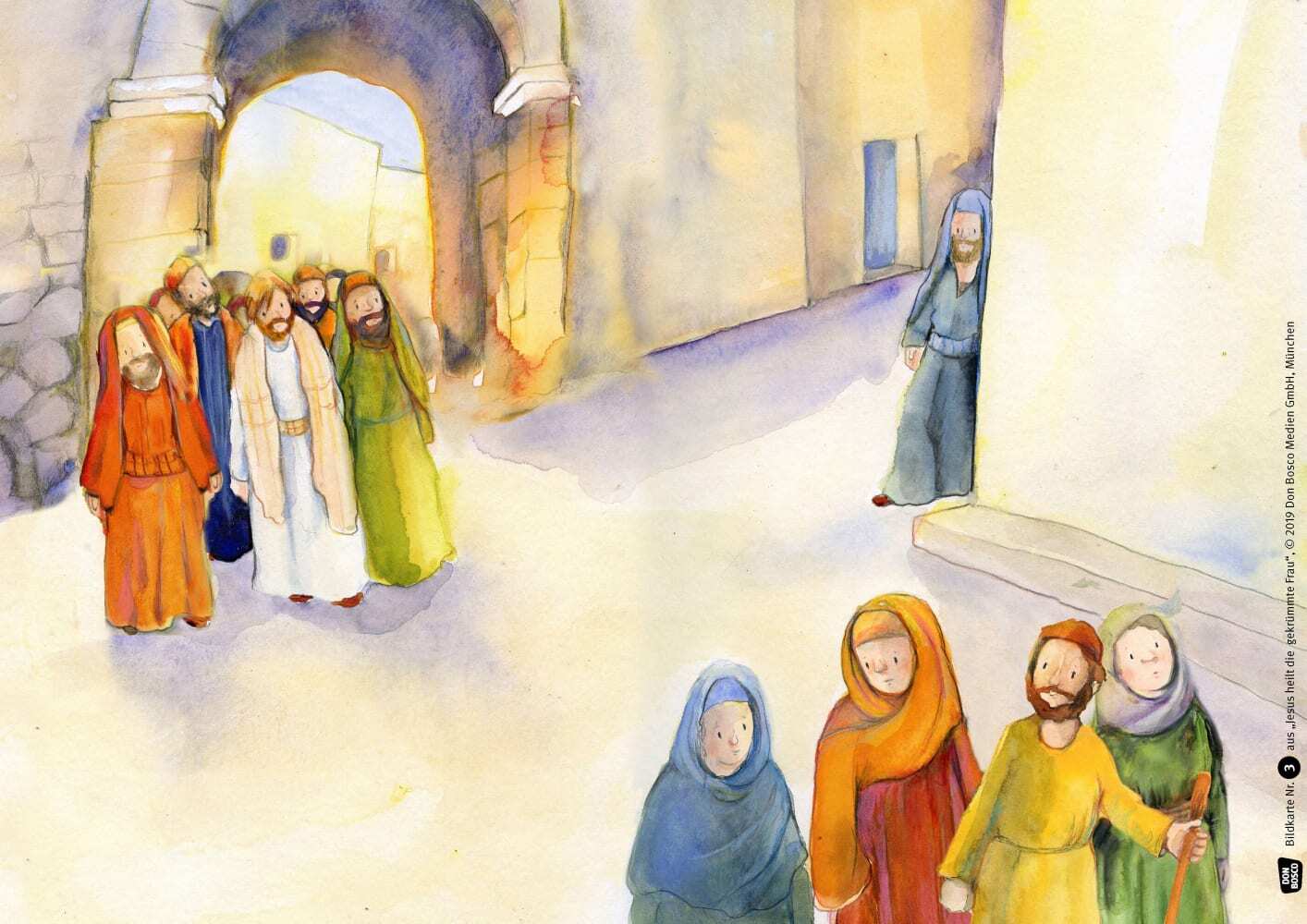 Am Sabbat heilt Jesus eine Frau, die lange krank und einsam war. Das lange Kranksein hat ihren Rücken krumm gemacht. Jeden Tag quält sich die Frau durch ihr Leben. Sie ist sehr einsam, denn sie geht nun schon so gebeugt, dass niemand mehr ihr in die Augen sehe...