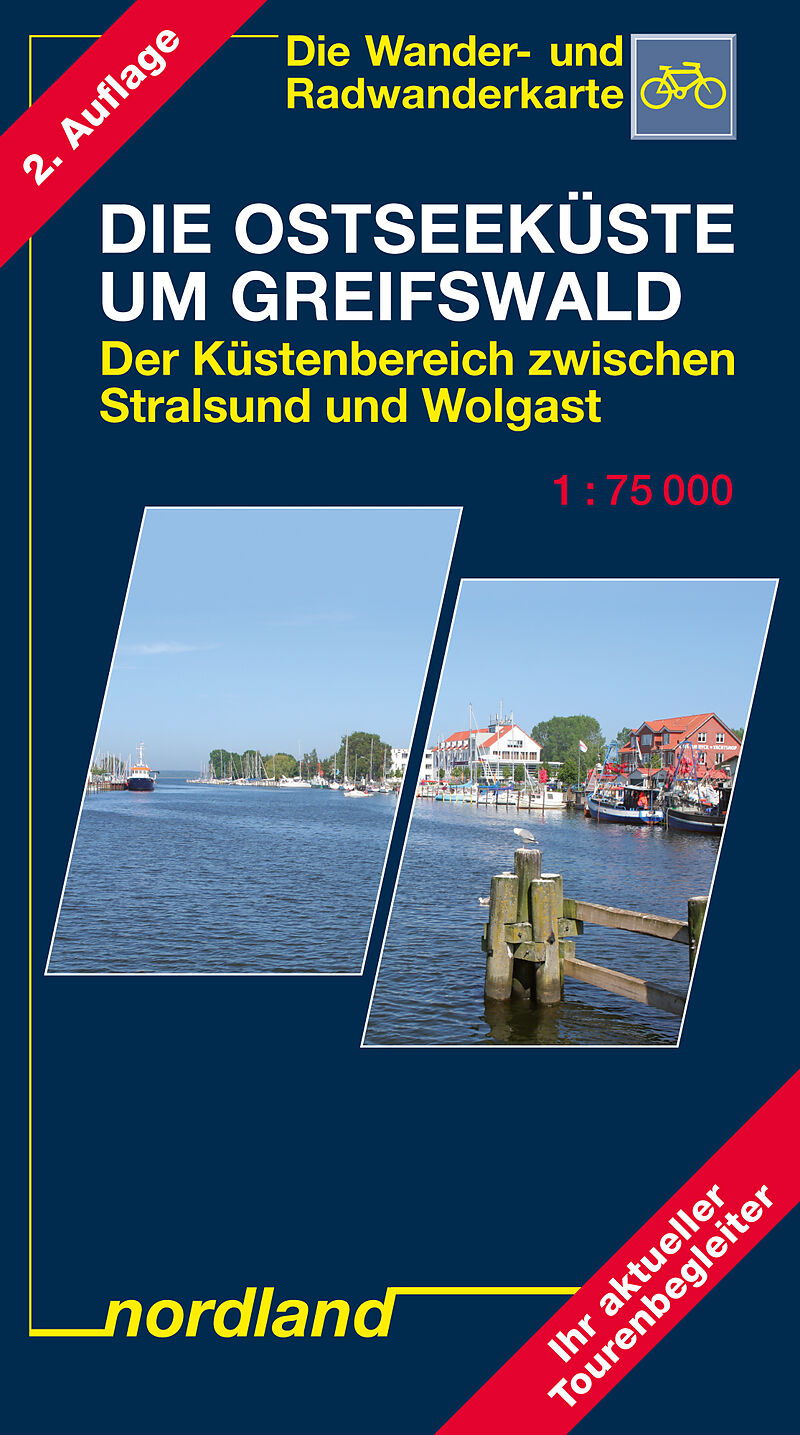 Die Wander- und Radwanderkarte zeigt den Küstenbereich zwischen Stralsund und Wolgast. Ihr aktueller Tourenbegleiter im Maßstab 1:75000.