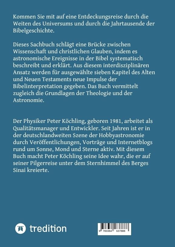 Dies ist eine einzigartige Entdeckungsreise durch die Weiten des Universums und durch die Jahrtausende der Bibelgeschichte. Dieses Sachbuch schlägt eine Brücke zwischen Wissenschaft und christlichen Glauben, indem es astronomische Ereignisse in der Bibel syste...