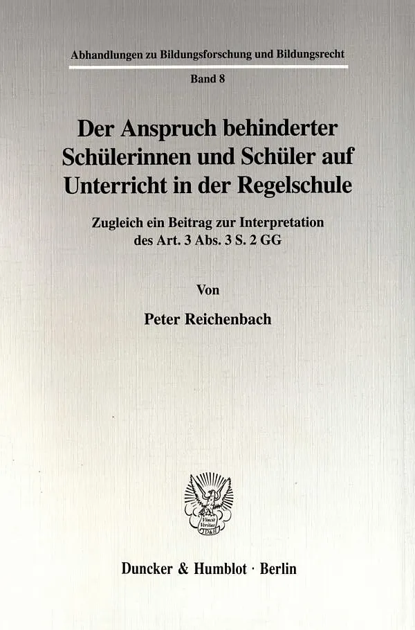 Inhaltsübersicht: Erster Teil: Einleitung und Problemaufriß: Problemstellung - Gang der Untersuchung - Zweiter Teil: Die Beurteilung des Unterrichts für behinderte Kinder und Jugendliche in Rechtsprechung und Lehre: Der Meinungsstand vor der Einführung des Art. 3 III 2 GG - Die Entwicklung seit der Reform des Grundgesetzes - Zusammenfassende Würdigung: Die Beurteilung der bisherigen Diskussion und mögliche Auswirkungen auf das niedersächsische Schulrecht - Dritter Teil: Ausgangspunkt - Die Einschlägigkeit des Art. 3 III 2 GG: Die Bestimmung des Begriffes »Behinderung« - Die Benachteiligung »wegen« einer Behinderung - Anwendung des Behinderungsbegriffs im Schulrecht - Vierter Teil: Eigener Ansatz - Die Gleichbehandlung behinderter Kinder und Jugendlicher im Schulrecht: Die mögliche Benachteiligung behinderter Kinder und Jugendlicher im Schulrecht - Der Gleichheitsbegriff der Art. 3 I, III 2 GG und seine Bedeutung für die Unterrichtung behinderter Kinder und Jugendlicher - Art. 3 III 2 GG als Garantie der Chancengleichheit für behinderte Kinder und Jugendliche im Schulwesen - Fünfter Teil: Die Grenzen des Art. 3 III 2 GG: Der »zwingende Grund« als Legitimation einer Ungleichbehandlung - Die Begrenzung durch kollidierendes Verfassungsrecht: Die Schulaufsicht des Staates gem. Art. 7 I GG - Die Begrenzung durch kollidierendes Verfassungsrecht: Grundrechte der nicht behinderten Schülerinnen und Schüler - Ergebnisse - Literaturverzeichnis - Stichwortverzeichnis