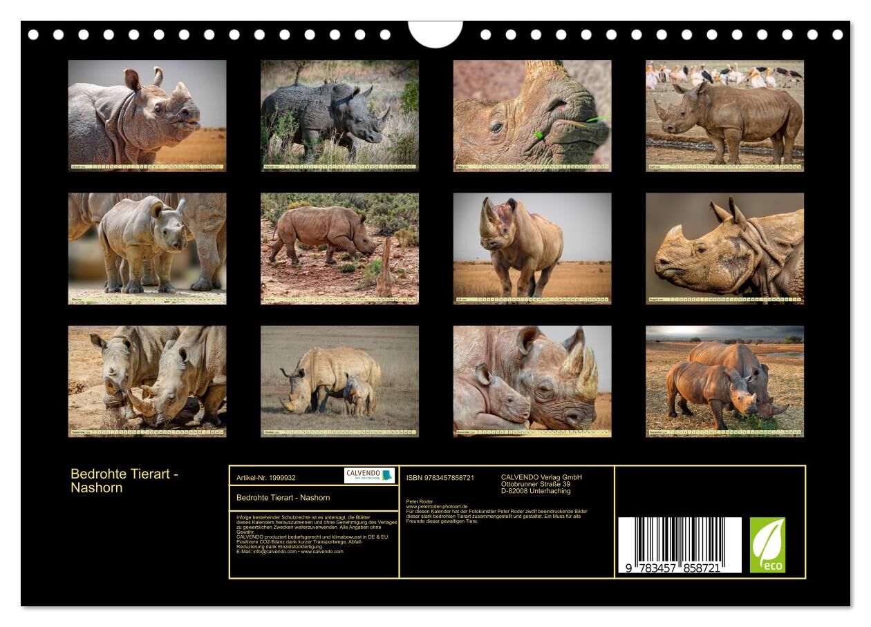 Für diesen Kalender hat der Fotokünstler Peter Roder zwölf beeindruckende Bilder dieser stark bedrohten Tierart zusammengestellt und gestaltet. Ein Muss für alle Freunde dieser gewaltigen Tiere.