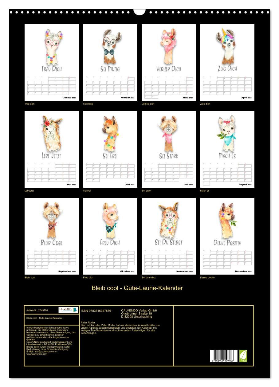 Der Fotokünstler Peter Roder hat wunderschöne Aquarell-Bilder der urigen Alpakas zusammengestellt und gestaltet. Ein Kalender mit lustigen Tier-Gesichtern und motivierenden Ratschlägen für alle Lebenslagen.