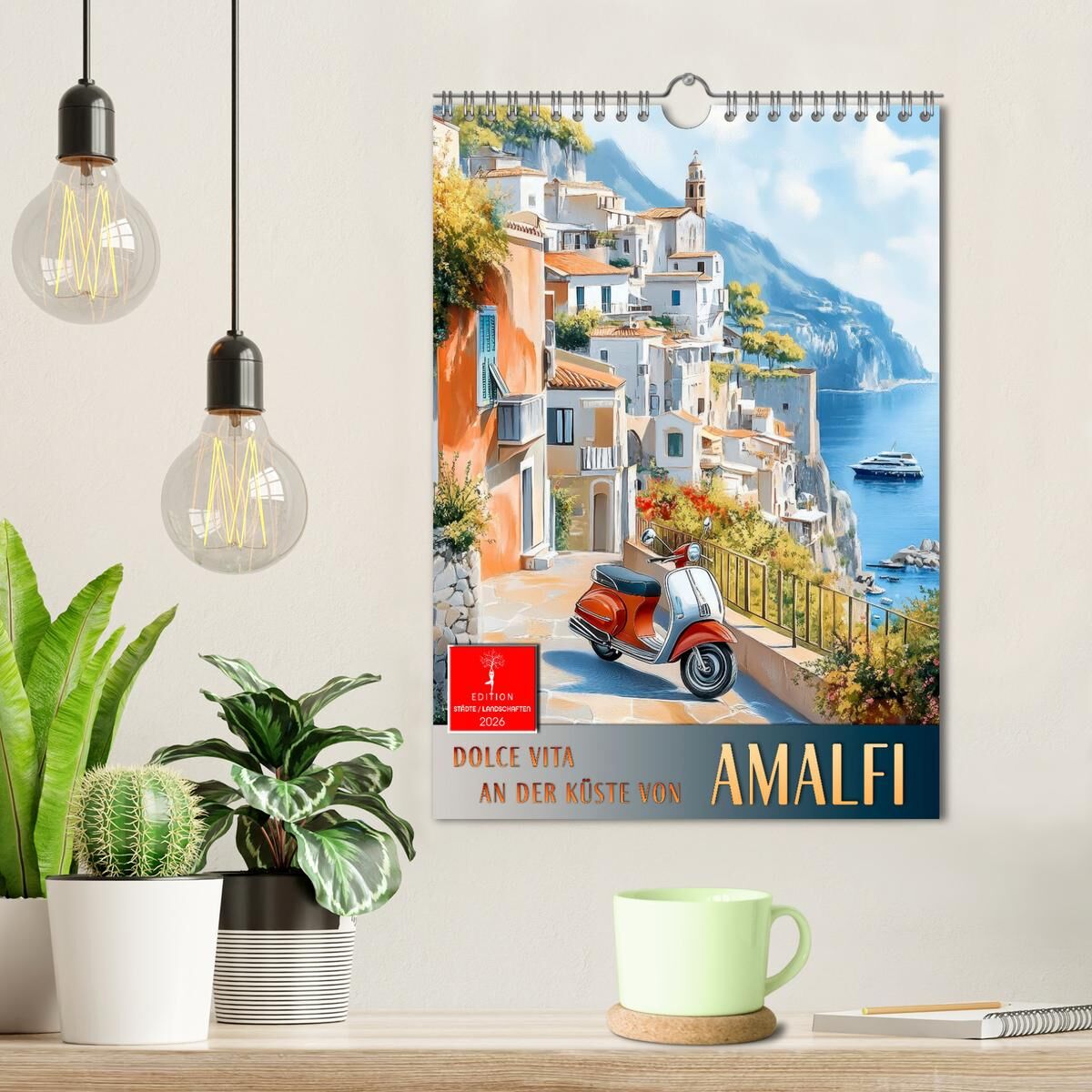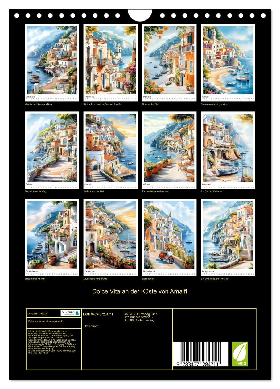Die Amalfiküste ein Sehnsuchtsort, der mit seinem mediterranen Charme verzaubert. Farbenfrohe Häuser schmiegen sich an steile Klippen, das tiefblaue Meer glitzert in der Sonne, und enge Gassen laden zum Flanieren ein. In diesem Kalender erwacht die Magie Itali...
