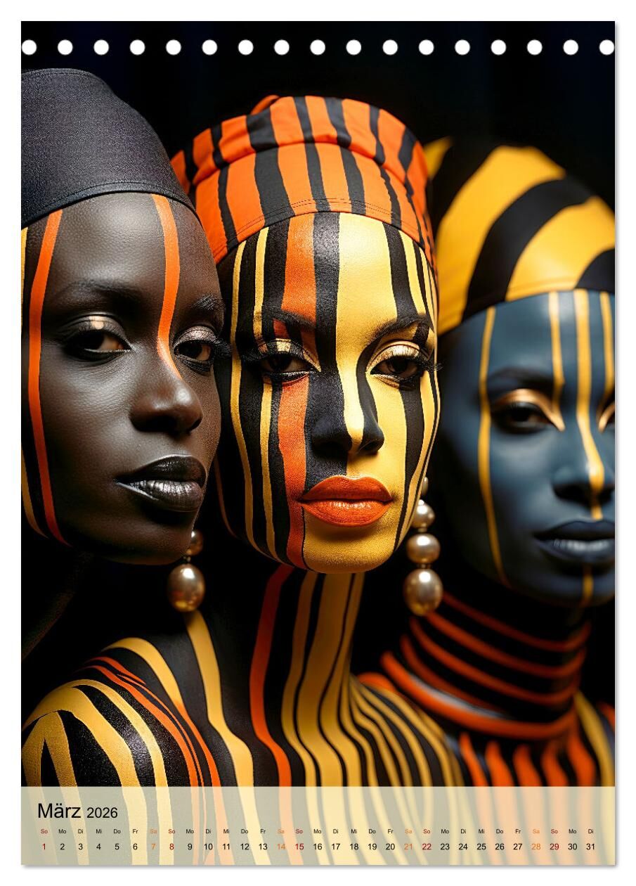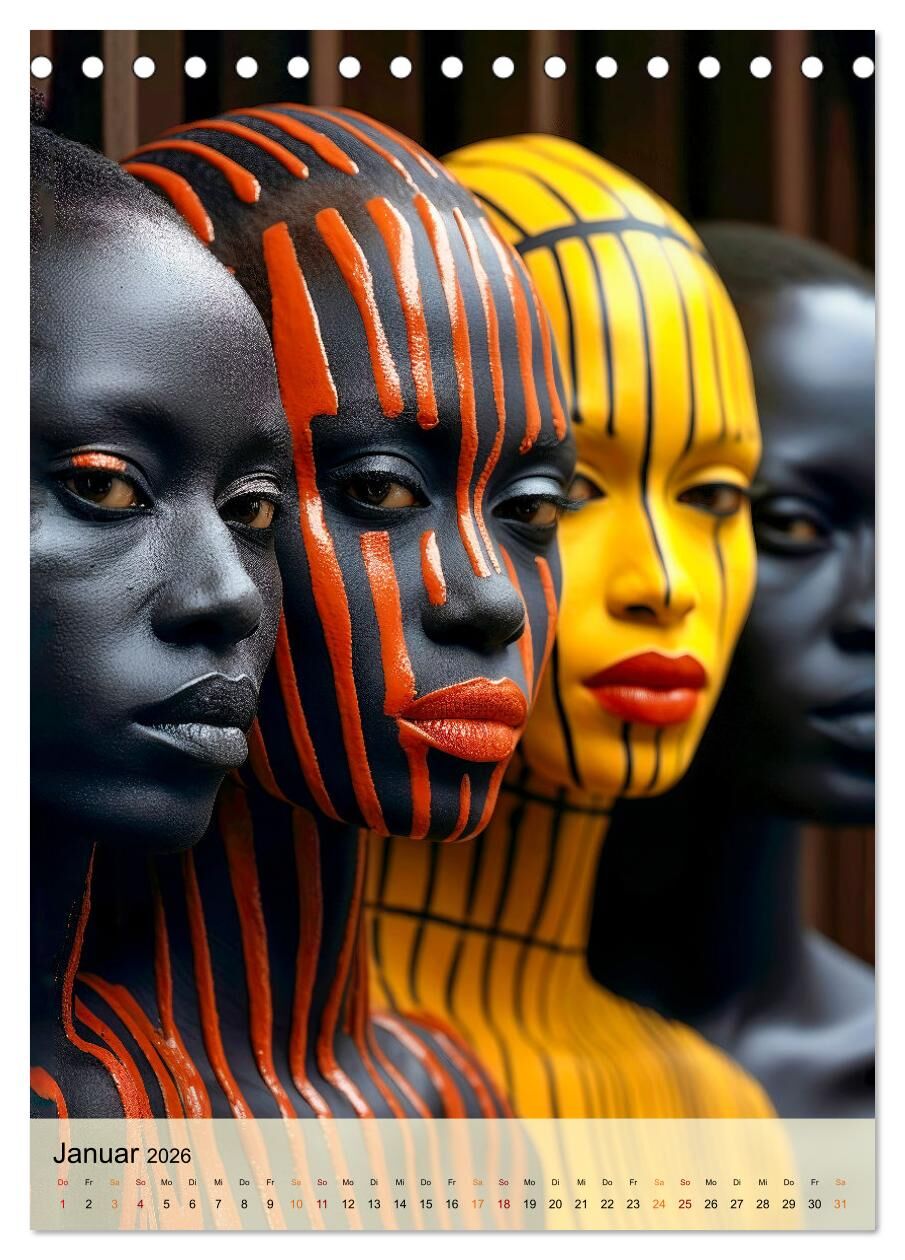 Erleben Sie Kunst in Bewegung! Entdecken Sie die Faszination von Bodypainting und Gesichtsbemalung, wenn vertikale parallele Striche in warmen Gelb- und berauschenden Rottönen zum Leben erwachen. Lassen Sie sich von den Models verzaubern, die die perfekte Vers...