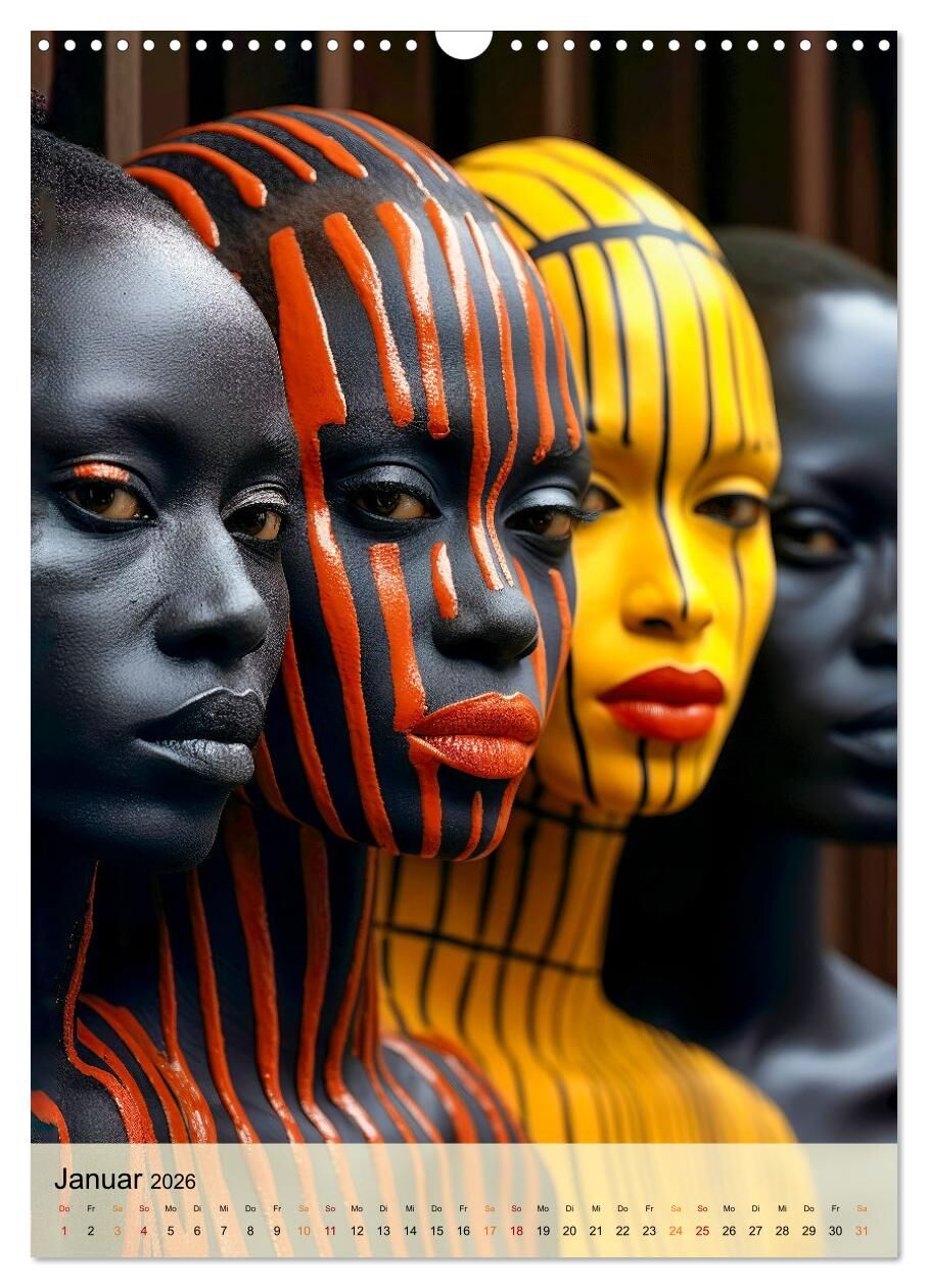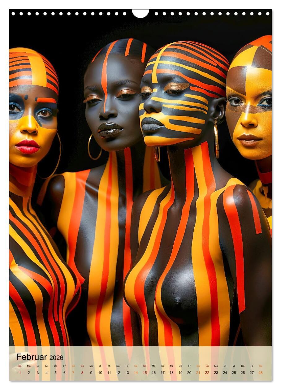 Erleben Sie Kunst in Bewegung! Entdecken Sie die Faszination von Bodypainting und Gesichtsbemalung, wenn vertikale parallele Striche in warmen Gelb- und berauschenden Rottönen zum Leben erwachen. Lassen Sie sich von den Models verzaubern, die die perfekte Vers...