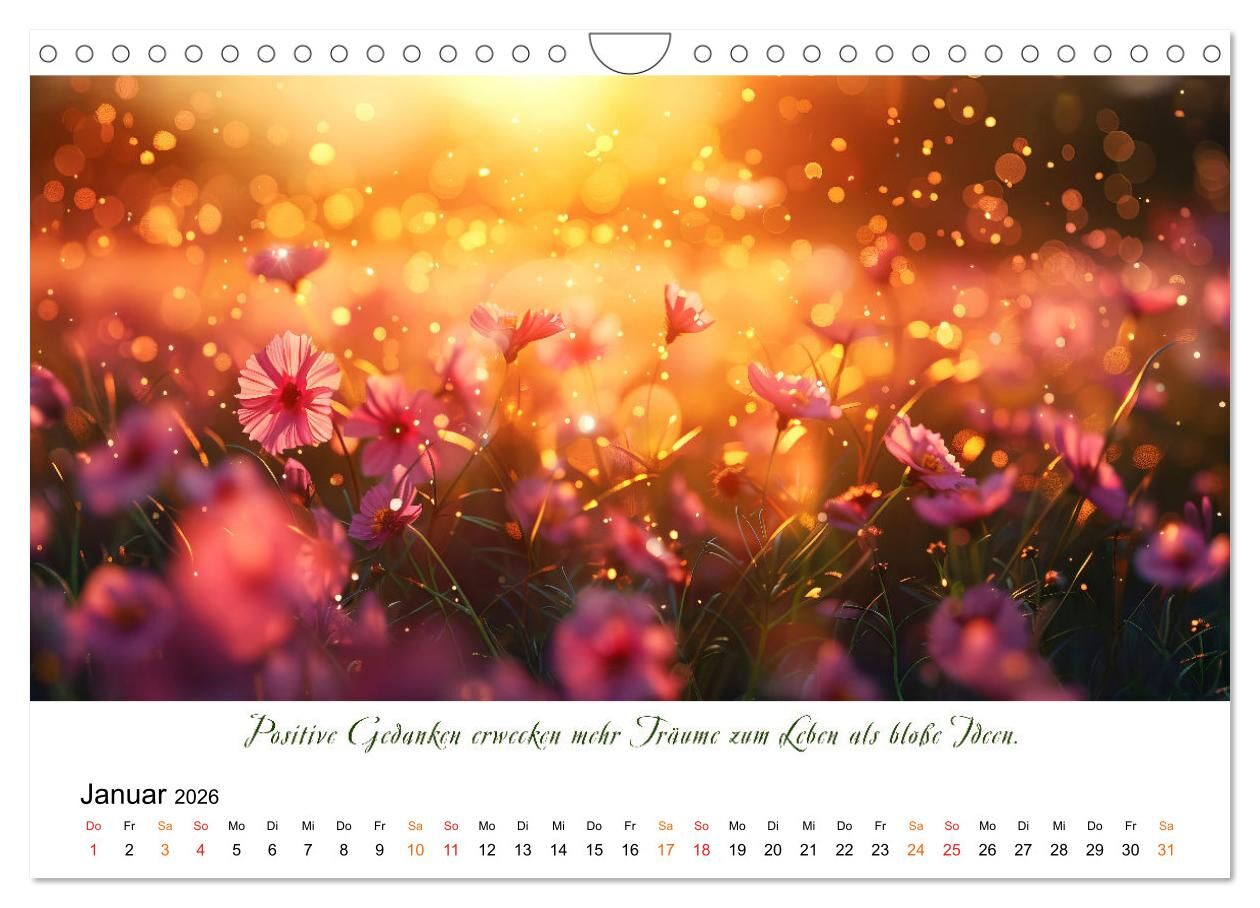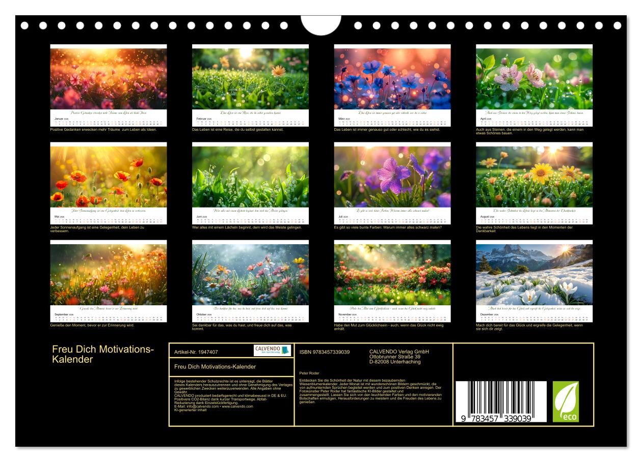 Entdecken Sie die Schönheit der Natur mit diesem bezaubernden Wiesenblumenkalender. Jeder Monat ist mit wunderschönen Bildern geschmückt, die von aufmunternden Sprüchen begleitet werden und zum positiven Denken anregen. Der Fotokünstler Peter Roder hat fantast...