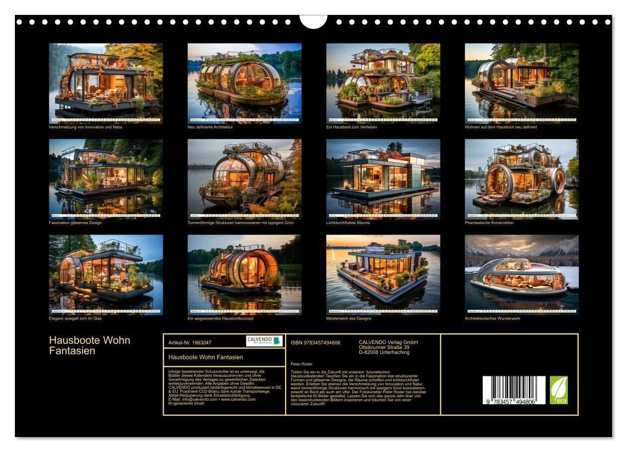 Treten Sie ein in die Zukunft mit unserem futuristischen Hausbootkalender! Tauchen Sie ein in die Faszination klar strukturierter Formen und gläserner Designs, die Räume schaffen und lichtdurchflutet werden. Erleben Sie ebenso die Verschmelzung von Innovation ...