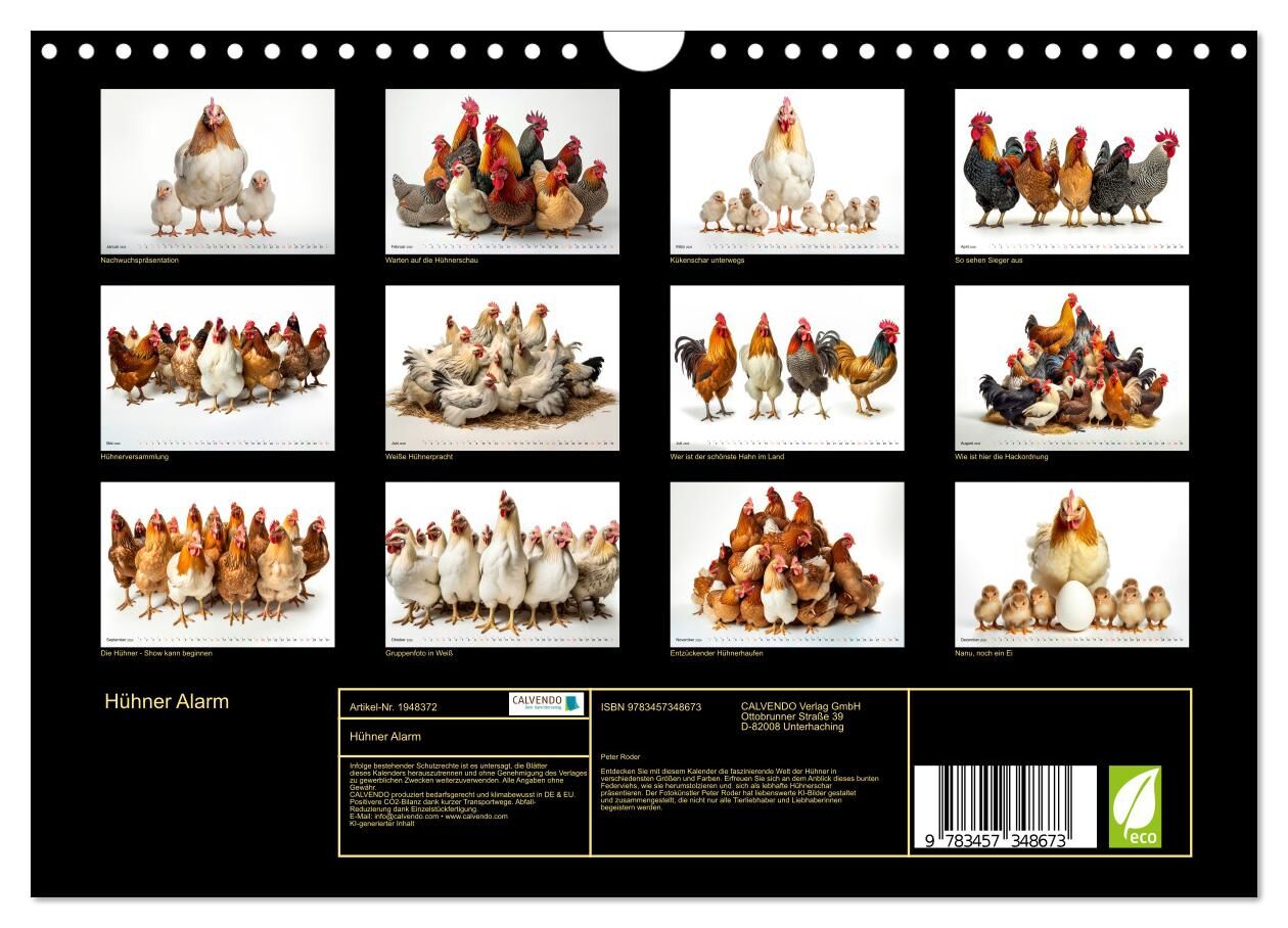 Entdecken Sie mit diesem Kalender die faszinierende Welt der Hühner in verschiedensten Größen und Farben. Erfreuen Sie sich an dem Anblick dieses bunten Federviehs, wie sie herumstolzieren und sich als lebhafte Hühnerschar präsentieren. Der Fotokünstler Peter ...