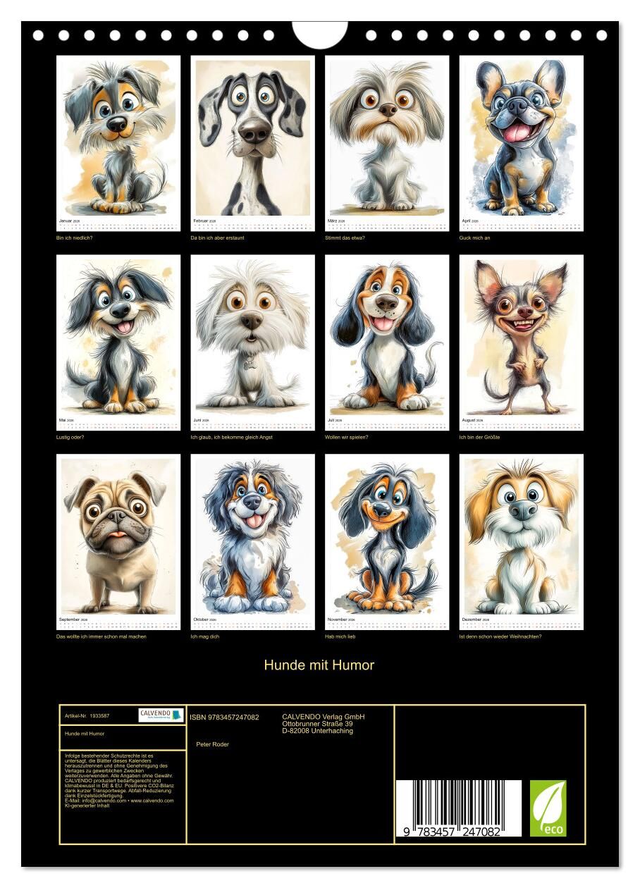 Lachen Sie sich durch das Jahr, denn jeden Monat erwartet Sie ein neuer, hinreißend komischer Vierbeiner, liebevoll und mit viel Witz als Cartoon in Szene gesetzt. Vom fröhlichen Golden Retriever über einen angeberischen Chihuahua bis hin zum verträumten Lhaso...