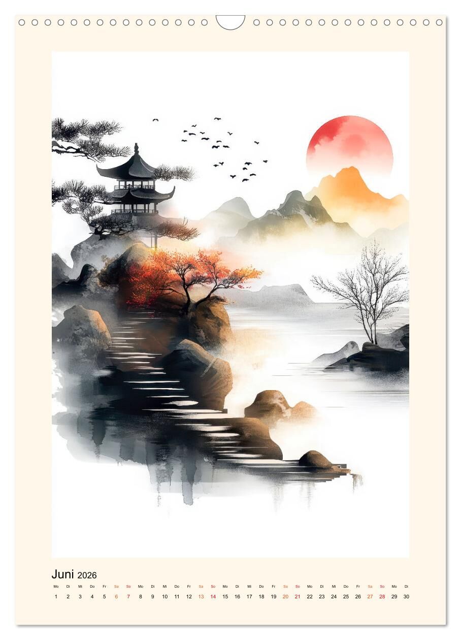 Tauchen Sie ein in die faszinierende Welt der traditionellen japanischen Landschaftsmalerei. Jeder Monat entführt Sie in die unvergleichliche Schönheit dieser Kunst. Bestaunen Sie den majestätischen Fuji, eingerahmt von einem Torii, das wie eine Einladung wirk...