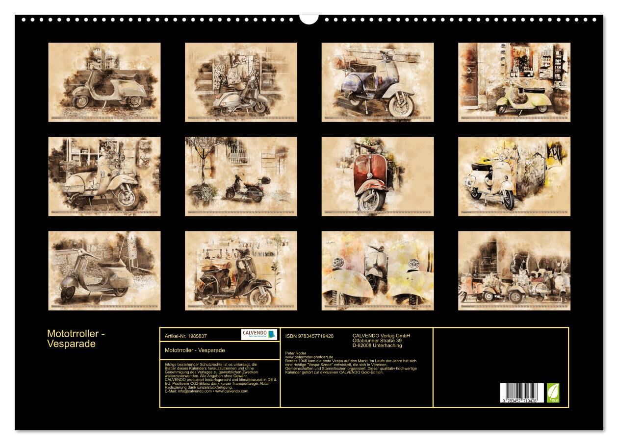 Bereits 1946 kam die erste Vespa auf den Markt. Im Laufe der Jahre hat sich eine richtige "Vespa-Szene" entwickelt, die sich in Vereinen, Gemeinschaften und Stammtischen organisiert. Dieser qualitativ hochwertige Kalender gehört zur exklusiven CALVENDO Gold-Ed...