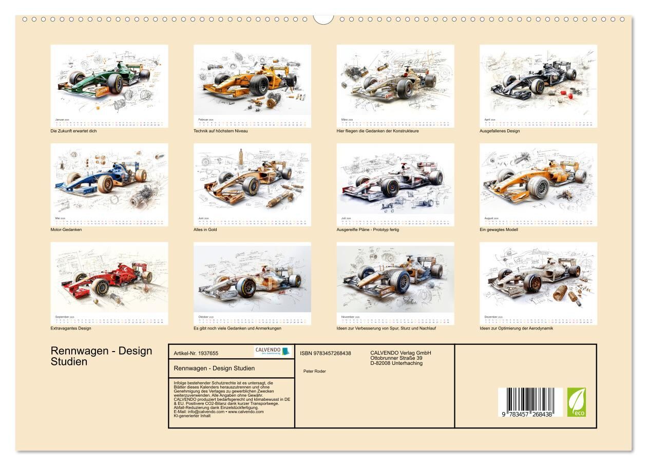 Geschwindigkeit beginnt mit einer Idee und dieser Kalender zeigt den Moment, in dem Visionen auf Papier Gestalt annehmen. Jedes grandiose KI-Bild präsentiert einen einzigartigen Rennwagen, dessen Design mal futuristisch, mal revolutionär erscheint. Jedes Fahrz...