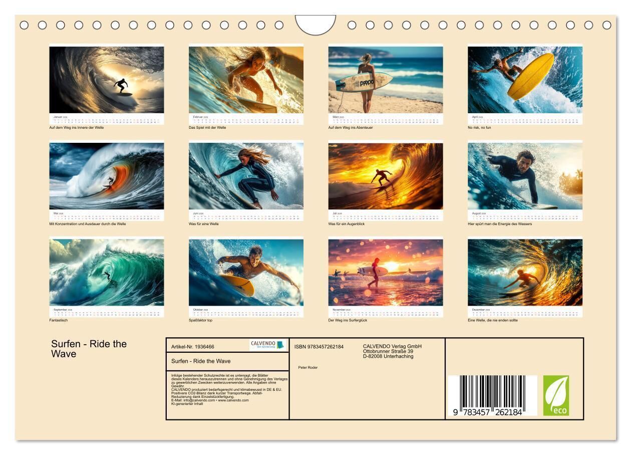Dieser Kalender fängt die Faszination des Wellenreitens in spektakulären KI-Bildern ein. Er zeigt Surferinnen und Surfer, die sich mit beeindruckender Eleganz in riesige Wellen stürzen, die Balance auf der Wasseroberfläche halten und mit der Kraft des Meeres s...