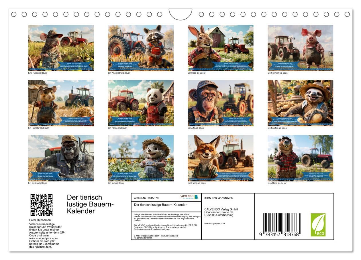 Entdecken Sie den ultimativen Jahresbegleiter für jeden Bauernhof und Tierliebhaber. "Der tierisch lustige Bauern-Kalender". Mit einer einzigartigen Sammlung von herzerwärmenden und zum Brüllen komischen KI-Bildern, zeigt dieser Kalender Ihre liebsten Vierbein...