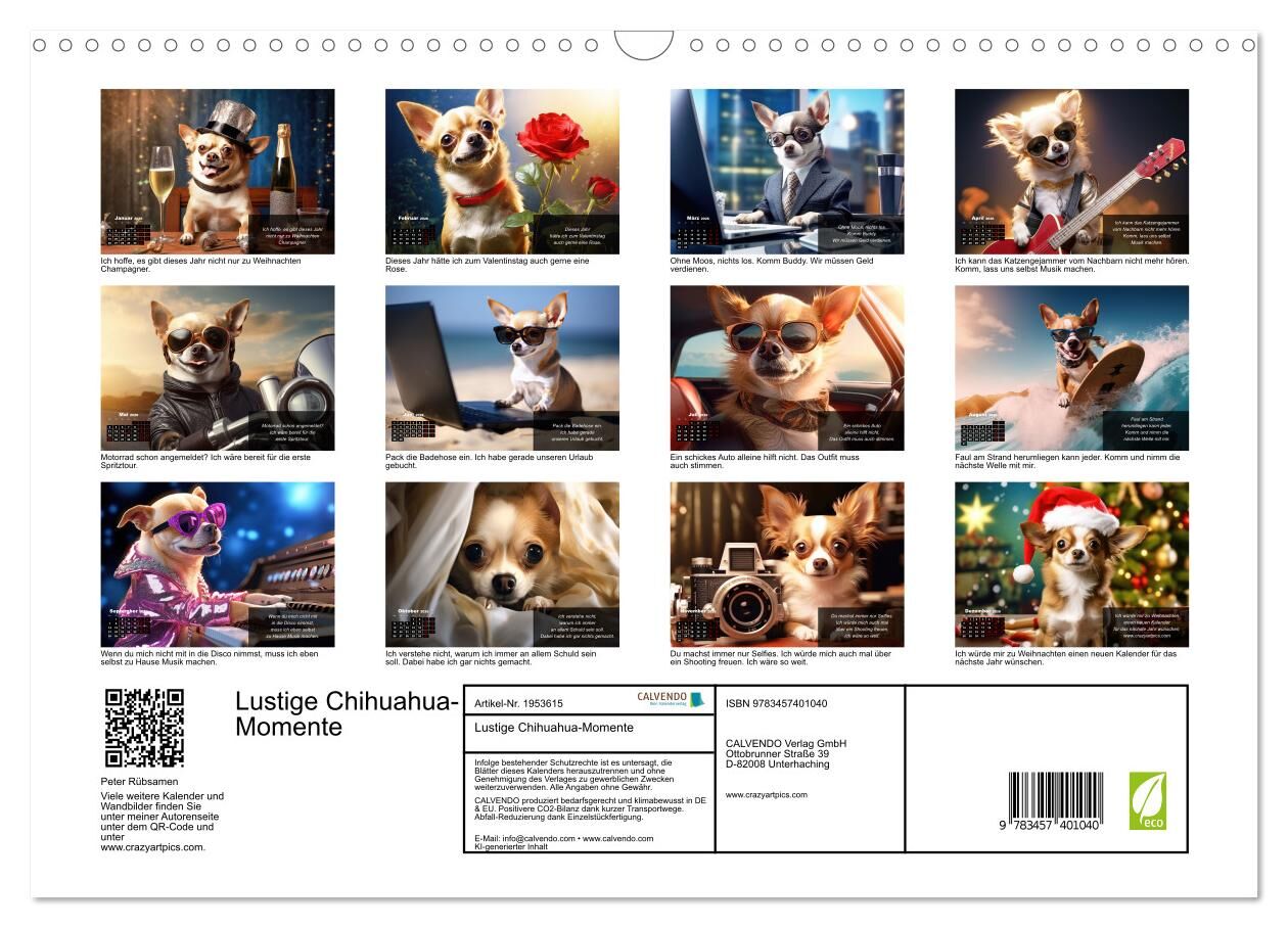 Entdecken Sie den ultimativen Jahreskalender für alle Chihuahua-Liebhaber! Unser einzigartiger Kalender präsentiert eine Sammlung von humorvollen und herzerwärmenden Chihuahua-Motiven, die durch KI generiert wurden. Jedes Bild wird von einem passenden Spruch b...