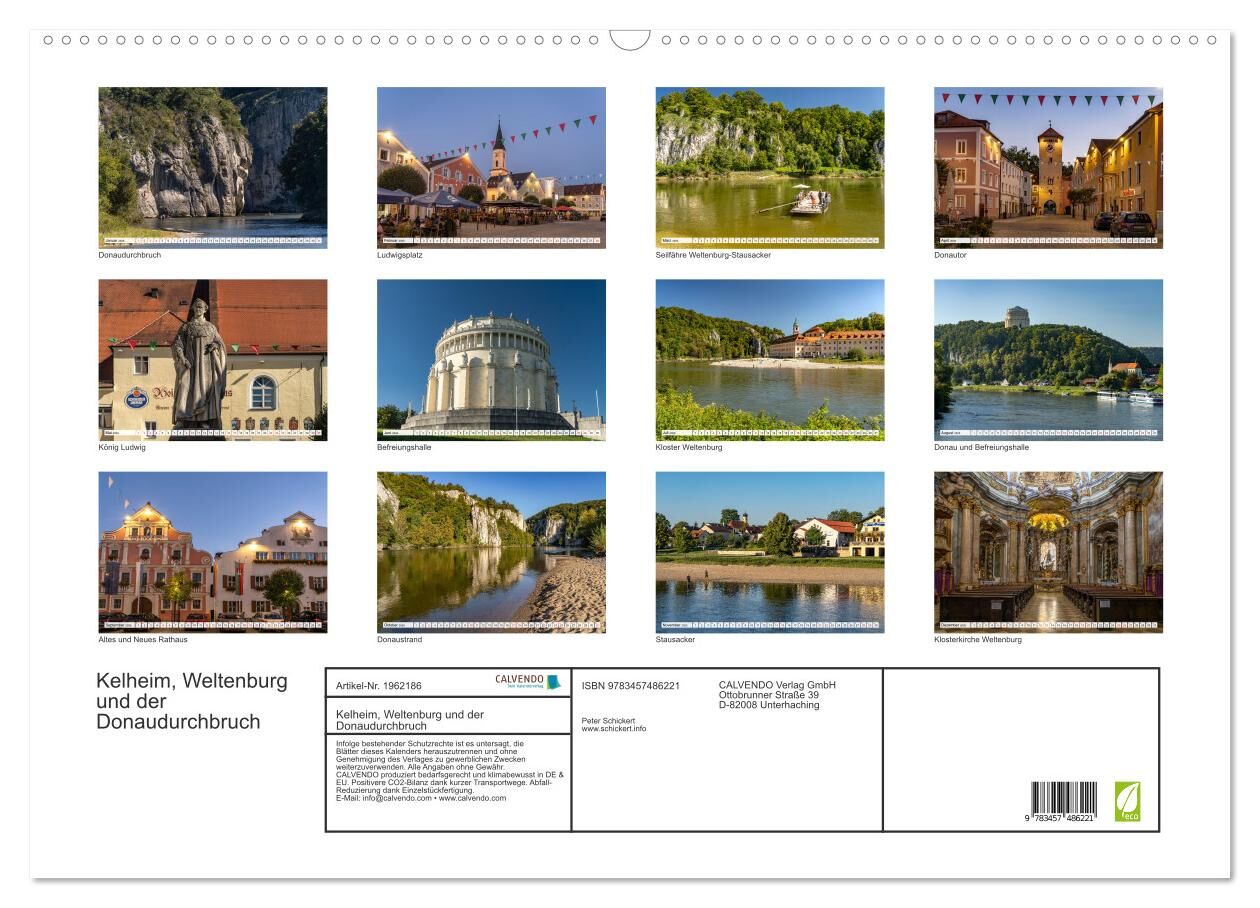 Dieser faszinierenden Kalender vom Reisefotografen Peter Schickert zeigt neben den Höhepunkten der Stadt Kelheim wie der Befreiungshalle auch eine der spektakulärsten Naturlandschaften Deutschlands - den Donaudurchbruch der Weltenburger Enge.