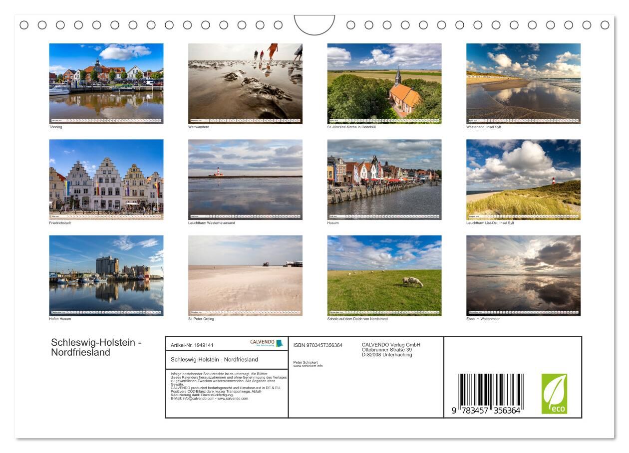 Dieser faszinierenden Kalender vom Reisefotografen Peter Schickert nimmt Sie mit auf eine Küstenreise ins schleswig-holsteinische Nordfriesland: von sehenswerten Städten wie Tönning oder Husum bis zu den Traumstränden von St. Peter oder der Insel Sylt.
