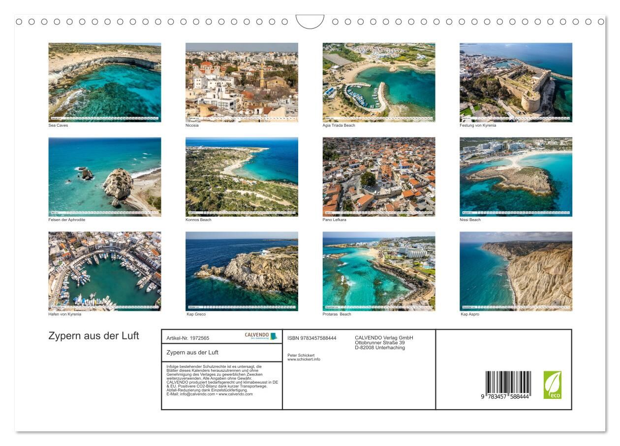 Dieser faszinierende Kalender vom Reisefotografen Peter Schickert zeigt die beliebte Insel Zypern mit ihren Traumstränden einmal aus einer anderen Perspektive: von hoch oben aus der Luft. 12 wunderbare Farbfotos von der Hauptstadt Nicosia zum malerischen Girne...