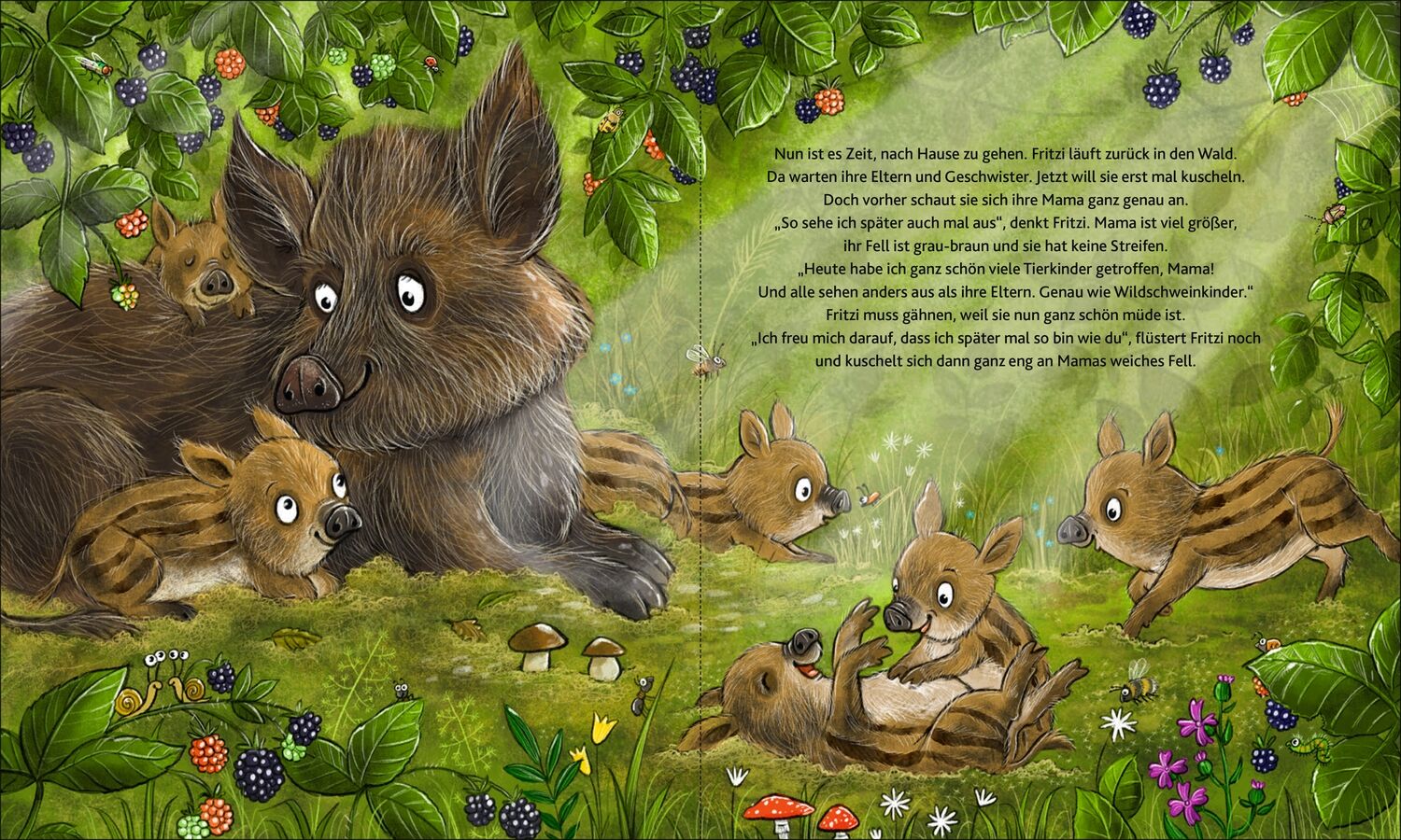 Bei einem Spaziergang durch den Wald fällt dem kleinen Wildschweinmädchen Fritzi etwas Spannendes auf: Fritzis Mama sieht ganz anders aus als sie selbst! Fritzi hat Streifen, ihre Mama nicht und Mamas Fell ist auch viel dunkler. Ob das bei anderen Tieren auch so ist? Verändern die sich auch, wenn sie groß werden? Das muss Fritzi herausfinden und tapst voller Neugier los. Auf ihrem Abenteuer bemerkt sie, dass es noch viele Tierkinder gibt, die ganz anders aussehen als ihr Eltern: Das Meisenbaby ist fast nackig, das Rehkitz hat Pünktchen und Schmetterlinge waren mal Raupen. Fritzi staunt: So viele Tierkinder, die sich verwandeln! Als das kleine Wildschweinmädchen zurück nach Hause kommt, hat es seiner Mama ganz schön viel zu erzählen.
