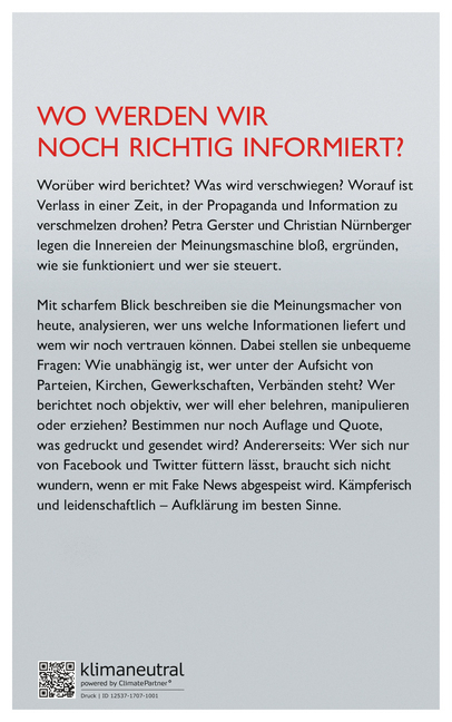 Warum wir nicht mehr richtig informiert werden Worüber wird berichtet? Was wird verschwiegen? Was ist wahr, worauf ist Verlass in einer Zeit, in der Propaganda und Information zu verschmelzen drohen? Petra Gerster und Christian Nürnberger steigen in den Maschi...