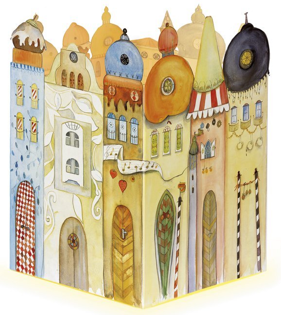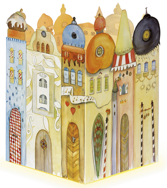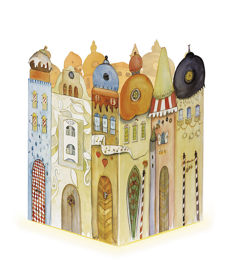 Ein Windlicht, in der Mitte des Adventskalenders "Leuchtendes Städtchen" aufgestellt, erhellt nicht nur die Häuser darauf, sondern auch unsere Gemüter. Täglich kann ein weiteres Fenster oder Türchen geöffnet und eine dahinter verborgene Illustration zum Leucht...