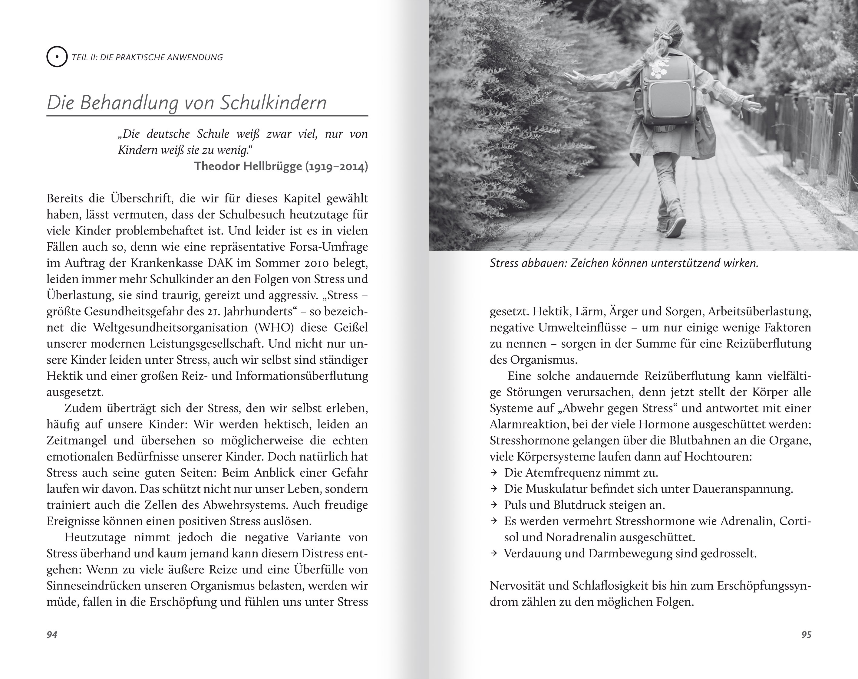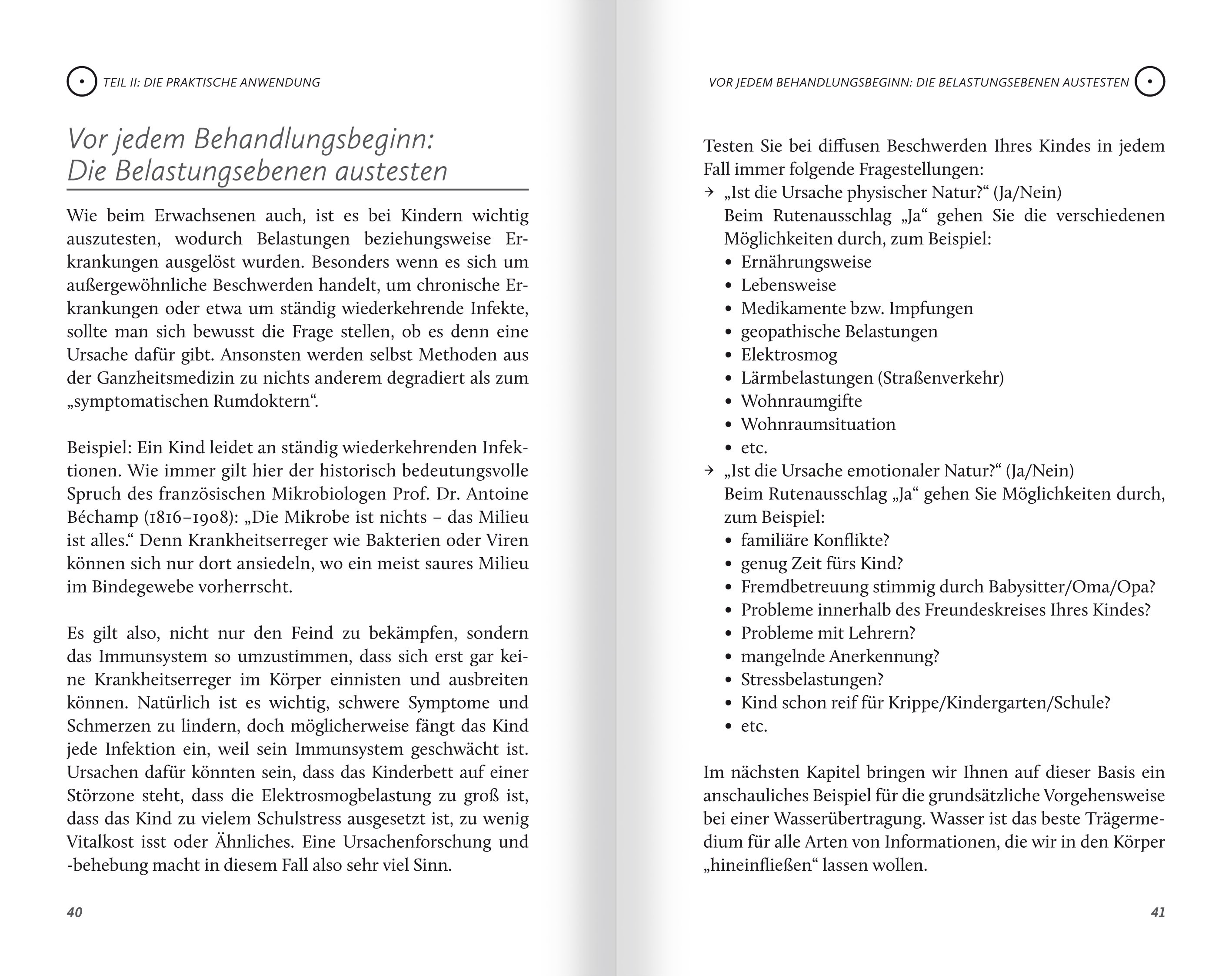 ((Auszug aus "Teil I: Wie funktioniert die Neue Homöopathie bei Kindern?")) Kinder sind keine kleinen Erwachsenen, sie sind Menschen mit einer eigenen Wahrnehmungs-, Sinnes- und Gefühlswelt. Und auch ihre "Vernunft" kann nicht mit der eines Erwachsenen verglichen werden. Was aus dem Blickwinkel der Kinder eine vernünftige Handlung zu sein scheint (...), kann nicht mit den Kriterien Erwachsener verstanden werden. Dies gilt natürlich in höherem Maße für kleine Kinder unter sechs Jahren, also in der Vorschulzeit. Je jünger das Kind ist, desto stärker ist es verhaftet in seiner eigenen, eher "magischen" Welt der märchenhaften Bilder und Gefühle. Träume, Fiebervisionen, Fernsehsendungen und Videobilder werden von Kindern dieser Altersstufe als fast genauso real eingeschätzt wie die Eindrücke des Tagesbewusstseins. Umso schlimmer ist es oft für sie, wenn wir Erwachsene versuchen, sie mit einem "Sei doch vernünftig!" oder "Das ist doch alles bloß Einbildung!" ihrer für sie realen Welten zu berauben. Die Kinder fühlen sich dann eher verunsichert, als wenn wir auf ihre Ängste vor den nächtlichen Gespenstern einfühlsam mit einem "Wie sieht dieser Geist denn aus?" reagieren. Kleine Kinder können uns auch nicht wie Erwachsene schildern, wo genau es wehtut oder wie sich dieser oder jener Schmerz anfühlt (...). Oft ist alles "Bauchweh", auch wenn das Kind meint: "Mir ist schlecht, enn ich an den Kindergarten denke." Selbst ältere Kinder kann der Therapeut nicht so ohne Weiteres einfach interviewen, auch hier gilt es, mehr zwischen den Zeilen zu lesen, was wirklich los ist. (...) Meistens ist der Behandler auf die Schilderungen der Eltern angewiesen - und die wissen beileibe nicht alles über ihr Kind - und auf die eigene genaue Beobachtung des Verhaltens des Kindes oder des Jugendlichen. Wenn Sie Therapeut sind und heilende Zeichen und Symbole bei Kindern einsetzen möchten, sollten Sie überlegen, wie Sie herausbekommen, was das eigentliche Anliegen des Kindes ist: - Durch Beobachten des Kindes und ruhige Kontaktaufnahme. Spielen Sie lieber eine Weile mit dem Kind und gewinnen Sie sein Vertrauen. Nehmen Sie es ernst! - Durch Interviewen der Mutter oder des Vaters, möglichst ohne dass das Kind dabei ist! Erinnern Sie sich noch, wie unangenehm es war, wenn Papa oder Mama in Ihrem Beisein ÜBER Sie sprachen? - Testen des Themas mit der Einhandrute in Ruhe am Kind oder auch mithilfe eines Fotos des Kindes. Es macht nichts, wenn das Kind zwischendurch aufsteht, Sie haben seine Schwingung im Raum und können auch Themen abfragen, ohne dass das Kind die ganze Zeit über stillsitzen muss. Die Mutter kann das Kind oder den Säugling auf dem Schoß behalten, während Sie Ihre Testungen machen. Fühlen Sie sich in die Welt des Kindes ein: - Sprechen Sie in einer altersgemäßen Wortwahl mit dem Kind, holen Sie es in seiner Vorstellungswelt ab, dann sind die Heilungsimpulse Erfolg versprechender. Bei einer Informationsübertragung auf einen Stein sagen Sie zum Beispiel nicht: "Übertrage jetzt die Schwingungsfrequenz auf diesen Stein", sondern etwa: "Stell dir vor, wie jetzt deine Zauberfee auf diesen wunderschönen Stein hinüberfliegt; da bleibt sie fest sitzen und hilft dir immer, wenn du sie brauchst, okay?" Das funktioniert bei Kindern wunderbar, und Sie erhalten auch noch leuchtende Augen als Geschenk dazu! - Wenn Sie das Kind mit Heilzeichen bemalen wollen, holen Sie auf jeden Fall seine Erlaubnis ein; gehen Sie ni…