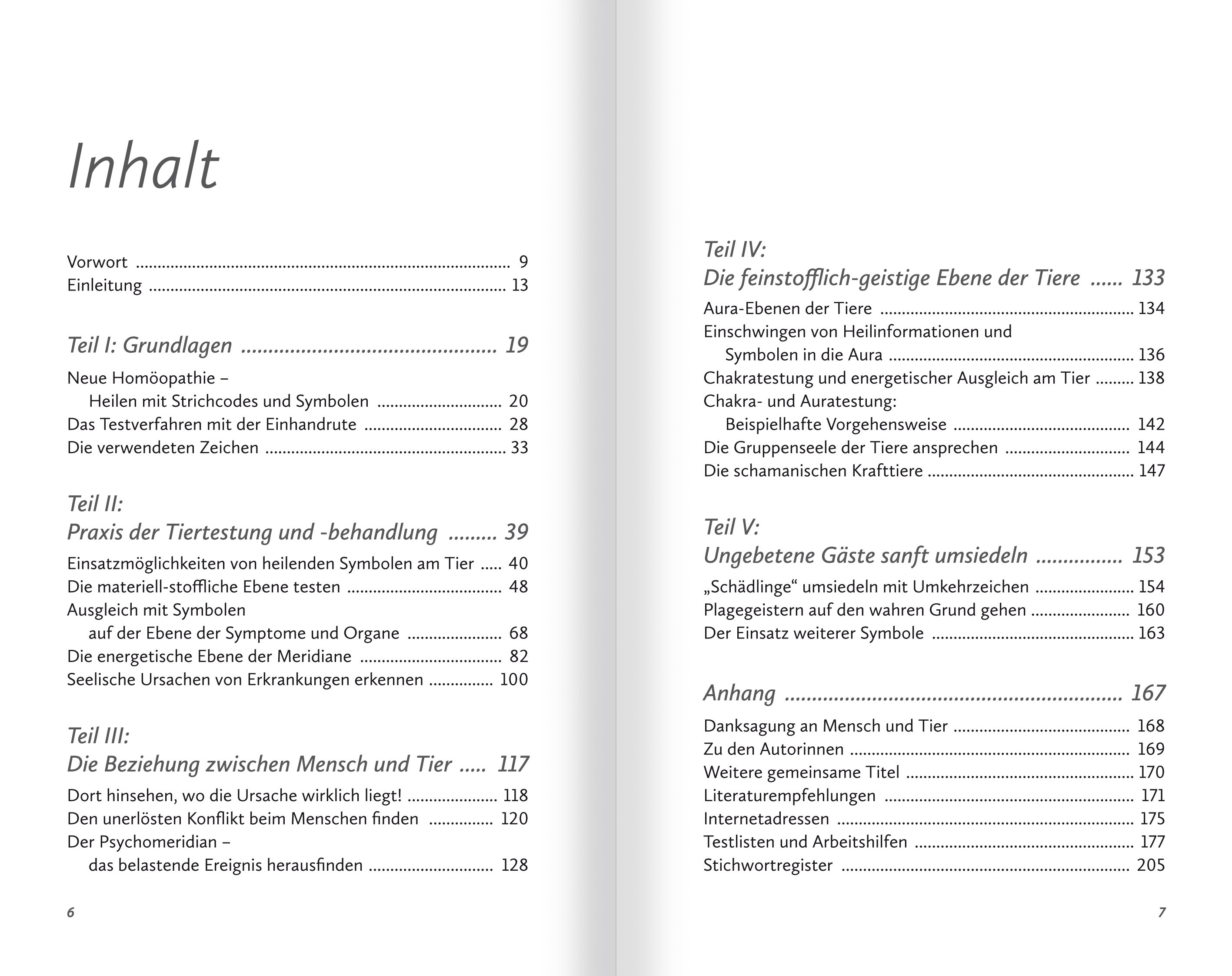 VORWORT Den dritten Band von "Medizin zum Aufmalen" widmen wir dem gesamten Tierreich. Er ist eine Würdigung der gesamten Tierwelt, die uns Menschen so viel Gutes zu geben hat. (...) Millionen Menschen leben mit Haustieren, Hunden, Katzen, Vögeln, Pferden, Hamstern, Meerschweinchen, Fischen, ja sogar mit Schlangen oder Spinnen aufs Engste zusammen. Wir lieben unsere tierischen Mitbewohner - und natürlich wollen wir nur das Beste für sie. Wir gehen regelmäßig zum Tierarzt, geben ihnen das "beste" Futter und ausreichend Streicheleinheiten. Dennoch werden unsere Tiere ab und zu krank, und in zunehmendem Maße auch chronisch krank; sie haben Zahnfleischentzündungen, rheumatische Gelenkbeschwerden, degenerative Erkrankungen, schwer auszuheilende innere Erkrankungen oder Verhaltensstörungen. Sie werden mit Antibiotika und Medikamenten behandelt, genau wie wir Menschen. Oft gibt es auf diesem Wege aber keine Besserung. Viele Tierhalter beschäftigen sich daher mit alternativen Möglichkeiten der Heilung. Dass die ganzheitliche Medizin gut funktioniert, können Skeptiker gerade an Tieren gut beobachten. Denn der viel diskutierte Satz "Man muss halt nur dran glauben" trifft bei Tieren sicher nicht zu. Landwirte, die beobachtet haben, wie sich ihre Kuh nach der Gabe einiger winziger Globuli schnell wieder von einer Krankheit erholte, wissen, wovon wir sprechen. Neben der klassischen Homöopathie und Bachblüten & Co. gibt es noch weitere wirkungsvolle und einfache Möglichkeiten der ganzheitlichen Tiermedizin. Egal, ob Sie interessierter Laie oder Tiertherapeut sind - mit der Methode der "Neuen Homöopathie" kann jeder arbeiten. Die Namensgebung dieser Heilweise stammt vom Wiener Forscher Erich Körbler, der die Wirkungen von Zeichen und Symbolen auf den lebenden Organismus viele Jahre lang erforschte und erfolgreich in der Praxis anwandte. In den ersten beiden Bänden unserer Ratgeber-Reihe "Medizin zum Aufmalen" haben wir die Methode Erich Körblers ausführlich beschrieben - ebenso andere Symbolsysteme, die heilbringend für den Menschen eingesetzt werden können. Im vorliegenden Buch möchten wir Ihnen zeigen, wie diese Informationsmedizin auch auf Tiere anwendbar ist. Tiere sind lebende Organismen, für die die gleichen Prinzipien gelten wie für uns Menschen. Und nicht selten möchten uns geliebte Haustiere unsere eigenen unerlösten Themen abnehmen - auch daran können sie erkranken. Die Praxis zeigt: Nicht selten muss deshalb sowohl das Tier als auch parallel dazu der Tierhalter behandelt werden. Die Neue Homöopathie besteht nicht aus einer Behandlung mit Globuli wie die klassische Homöopathie, sondern beruht auf einer energetischen Zustandstestung des Schwingungsfeldes des Tieres. Jedes Symptom, jede Beschwerde kann als Blockade, als "Widerstand" im Energiefeld interpretiert werden. Entsprechend muss der Heilimpuls darauf hinwirken, diese Blockade zu harmonisieren. Dieser Heilimpuls wird in der Neuen Homöopathie durch Striche, Zeichen oder Symbole gegeben, die vielfältig angewandt werden können, zum Beispiel indem sie auf die schmerzende Stelle gemalt werden. Oder das Thema wird auf einen Zettel geschrieben, mit Heilzeichen versehen und dann unter den Fressnapf gelegt, damit das Tier die Information aufnehmen kann. Seien Sie einfach neugierig, was passiert! Mit dieser Methode können Sie alle Tiere beeinflussen: So lassen sich auch kleine ungeliebte Tierchen wie Schnecken oder Läuse sanft umsiedeln. Sie können dafür sorgen, dass sich Zecken im Fell Ihres Tieres nicht mehr wohlfühlen oder Schnaken aus dem Zimmer verschwinden. Es ist sogar möglich, Tierhaarallergien zu beseitigen, ohne das geliebte Haustier hergeben zu müssen. (...) Wir hoffen, dass Sie in diesem Buch wertvolle Anregungen und Hilfen finden, um kleinere oder größere Probleme zu lösen oder Krankheiten bei Ihren geliebten Tieren auf den Heilungsweg zu bringen. Roswitha Stark und Petra Neumayer im September 2017