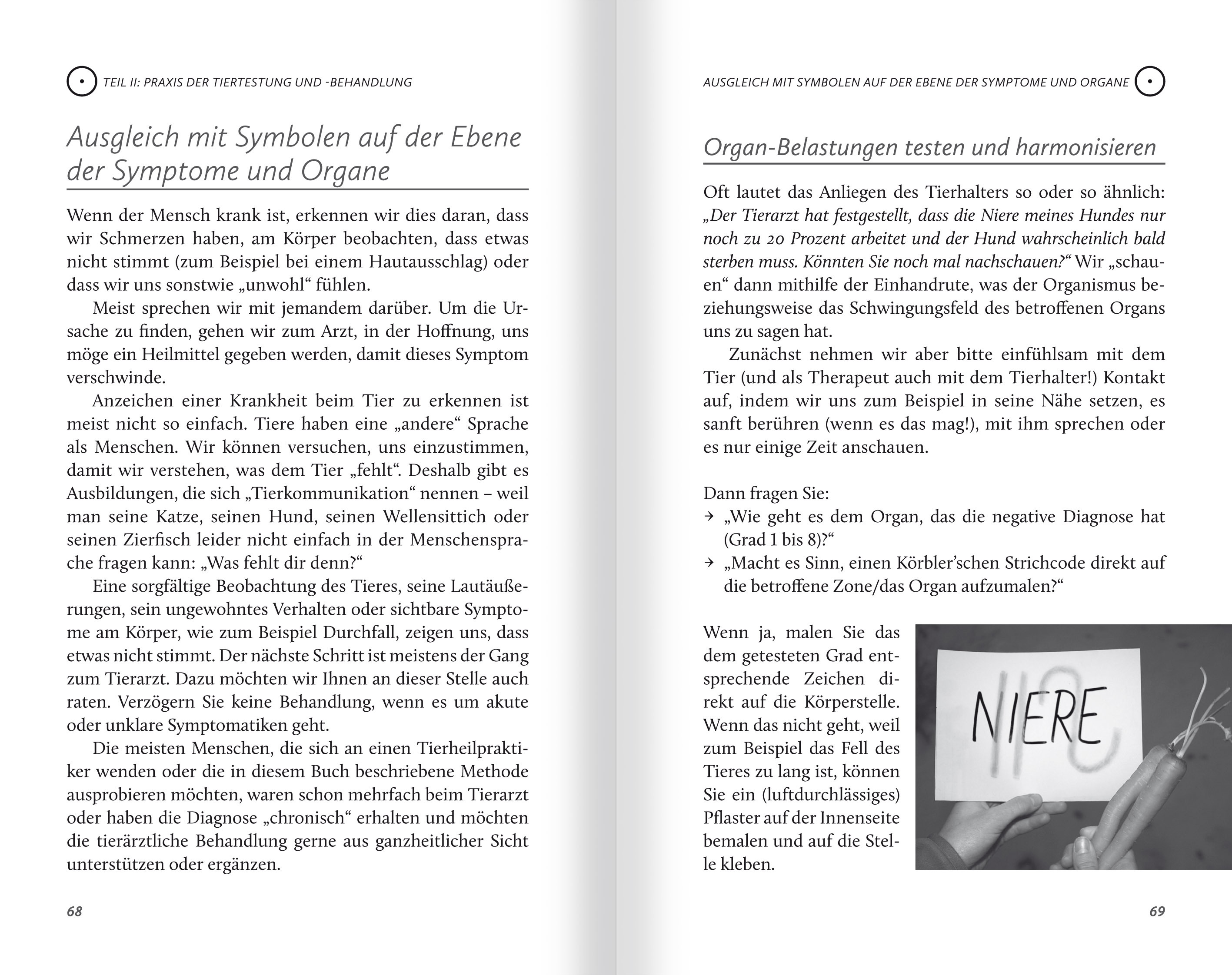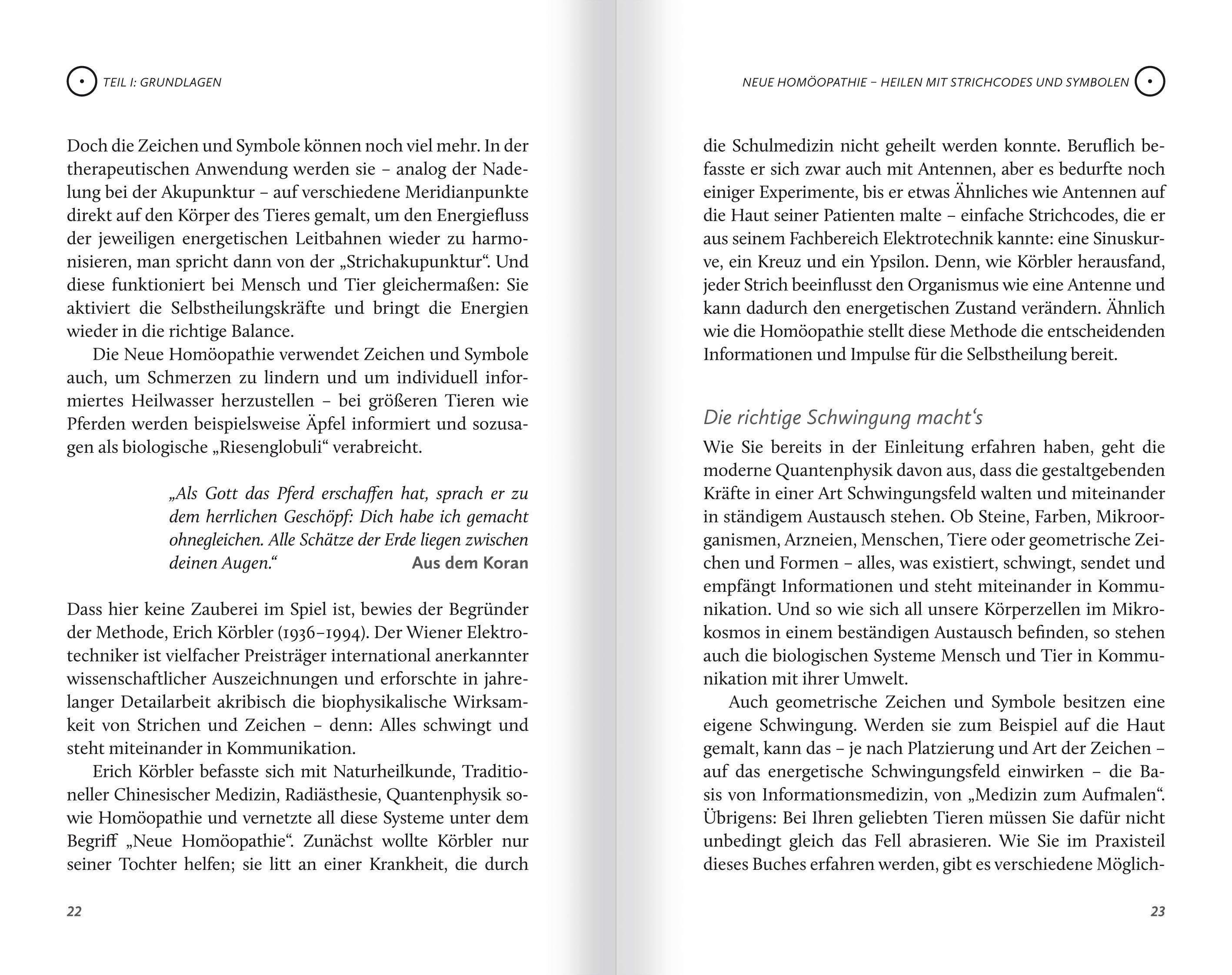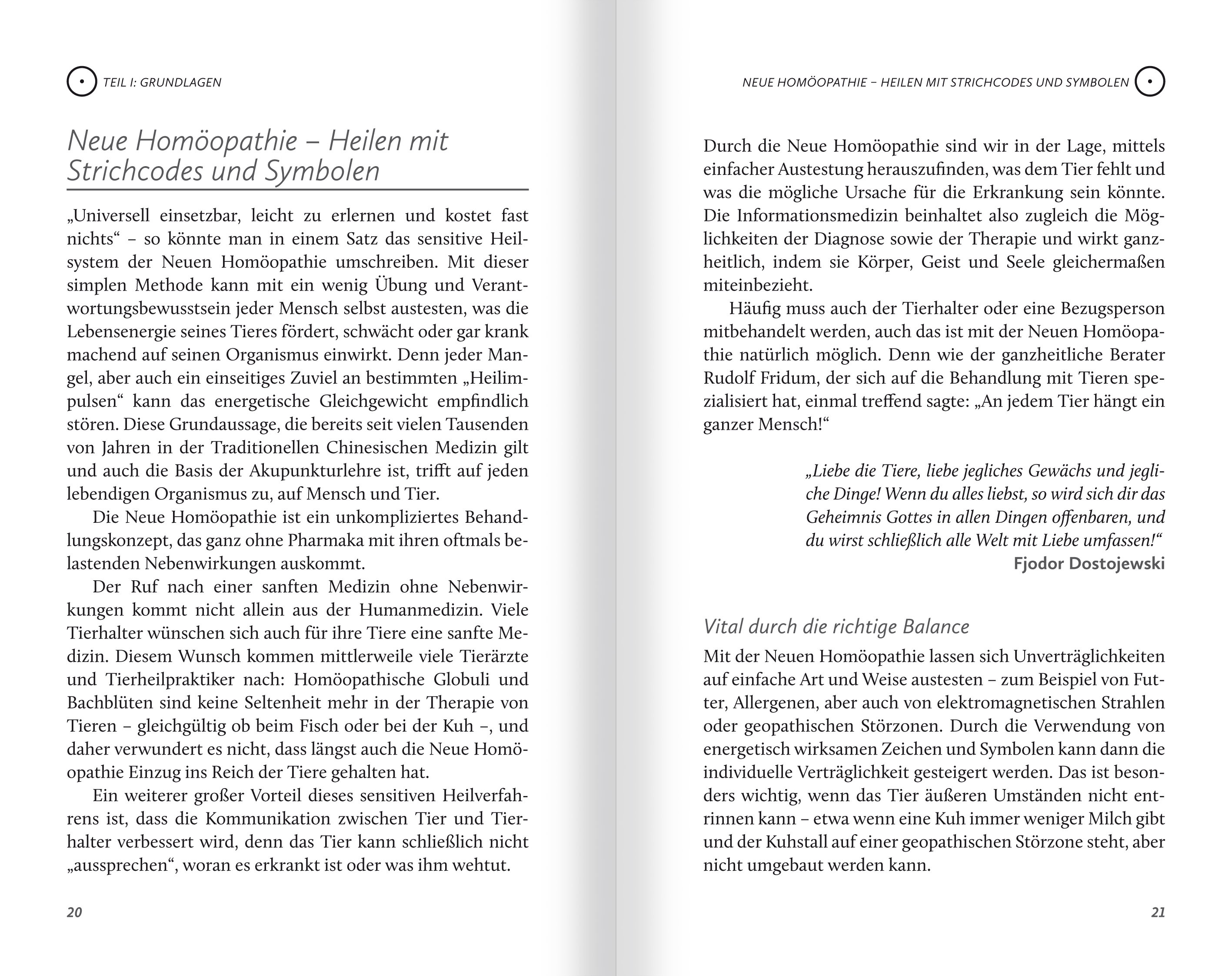((Auszug aus "Teil I: Grundlagen")) NEUE HOMÖOPATHIE - HEILEN MIT STRICHCODES UND SYMBOLEN "Universell einsetzbar, leicht zu erlernen und kostet fast nichts" - so könnte man in einem Satz das sensitive Heilsystem der Neuen Homöopathie umschreiben. Mit dieser simplen Methode kann mit ein wenig Übung und Verantwortungsbewusstsein jeder Mensch selbst austesten, was die Lebensenergie seines Tieres fördert, schwächt oder gar krank machend auf seinen Organismus einwirkt. Denn jeder Mangel, aber auch ein einseitiges Zuviel an bestimmten "Heilimpulsen" kann das energetische Gleichgewicht empfindlich stören. Diese Grundaussage, die bereits seit vielen Tausenden von Jahren in der Traditionellen Chinesischen Medizin gilt und auch die Basis der Akupunkturlehre ist, trifft auf jeden lebendigen Organismus zu, auf Mensch und Tier. Die Neue Homöopathie ist ein unkompliziertes Behandlungskonzept, das ganz ohne Pharmaka mit ihren oftmals belastenden Nebenwirkungen auskommt. Der Ruf nach einer sanften Medizin ohne Nebenwirkungen kommt nicht allein aus der Humanmedizin. Viele Tierhalter wünschen sich auch für ihre Tiere eine sanfte Medizin. Diesem Wunsch kommen mittlerweile viele Tierärzte und Tierheilpraktiker nach: Homöopathische Globuli und Bachblüten sind keine Seltenheit mehr in der Therapie von Tieren - gleichgültig ob beim Fisch oder bei der Kuh -, und daher verwundert es nicht, dass längst auch die Neue Homöopathie Einzug ins Reich der Tiere gehalten hat. Ein weiterer großer Vorteil dieses sensitiven Heilverfahrens ist, dass die Kommunikation zwischen Tier und Tierhalter verbessert wird, denn das Tier kann schließlich nicht "aussprechen", woran es erkrankt ist oder was ihm wehtut. Durch die Neue Homöopathie sind wir in der Lage, mittels einfacher Austestung herauszufinden, was dem Tier fehlt und was die mögliche Ursache für die Erkrankung sein könnte. Die Informationsmedizin beinhaltet also zugleich die Möglichkeiten der Diagnose sowie der Therapie und wirkt ganzheitlich, indem sie Körper, Geist und Seele gleichermaßen miteinbezieht. Häufig muss auch der Tierhalter oder eine Bezugsperson mitbehandelt werden, auch das ist mit der Neuen Homöopathie natürlich möglich. Denn wie der ganzheitliche Berater Rudolf Fridum, der sich auf die Behandlung mit Tieren spezialisiert hat, einmal treffend sagte: "A…