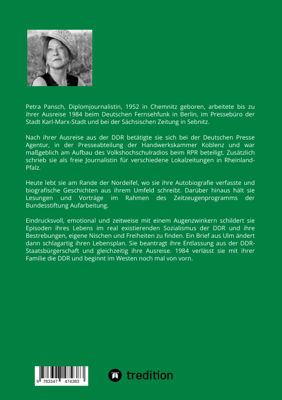 Eindrucksvoll, emotional und zeitweise mit einem Augenzwinkern, schildert Petra Pansch Episoden ihres Lebens im real existierenden Sozialismus der DDR und ihre Bestrebungen, eigene Nischen und Freiheiten zu finden. Ein Brief aus Ulm ändert dann schlagartig ihr...