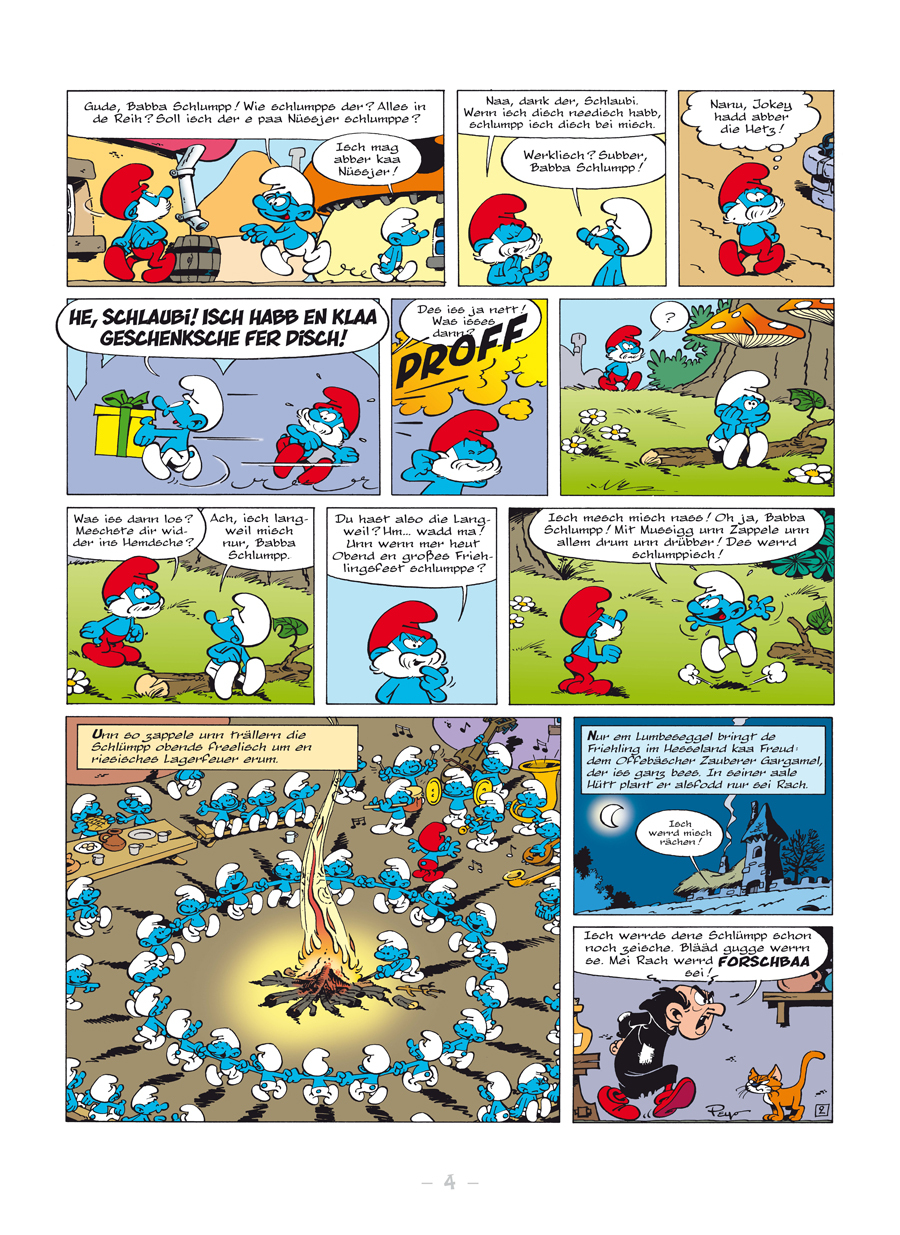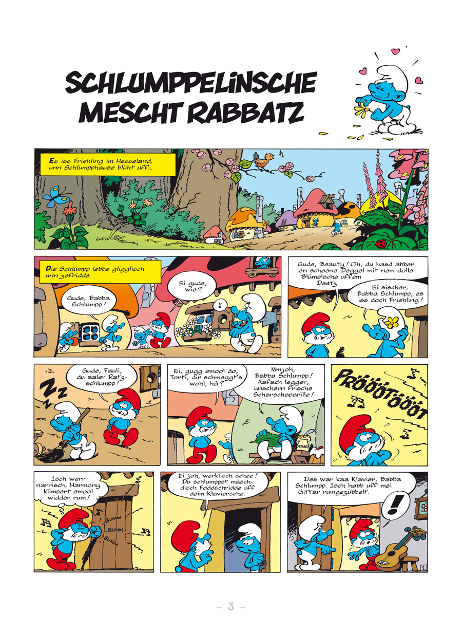 Midde im Hesseland lebbe die Schlümpp unn habbe jede Meng Spass minanner. Abber de aale Stinkstivvel Gargamel will dene net ihrn Ruh lasse. Also zauberd er sisch aaner zerecht unn mescht e klaa Schlumppfraa. Des is des Schlumppelinsche, die im Dorf von dene Sc...