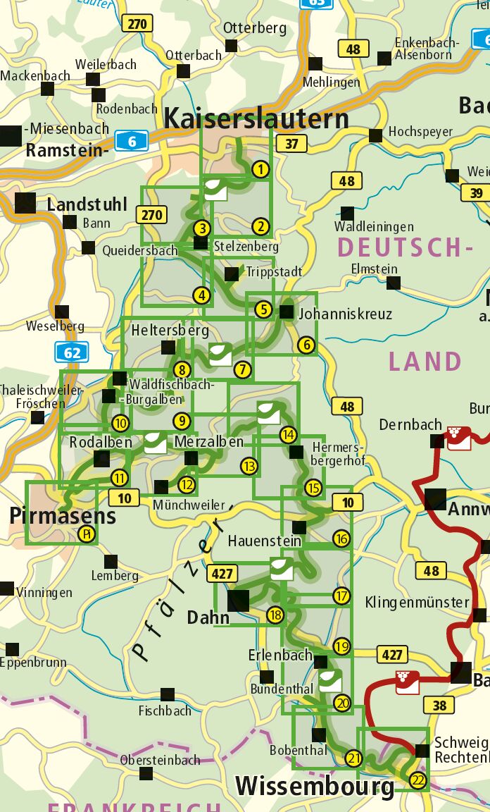 Das Karlstal bei Trippstadt mit seinem verwunschenen Bachlauf und den dahingewürfelten Felsbrocken ist gleich zu Beginn des 142 km langen Weges ein echtes Highlight. Die Burgruine Gräfenstein mit ihrem siebeneckigen Burgfried oder der grandiose Ausblick vom Lu...