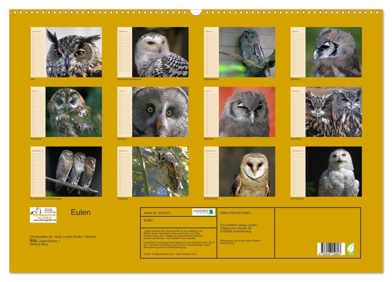 Eulen (Wandkalender 2026 DIN A2 quer), CALVENDO Monatskalender