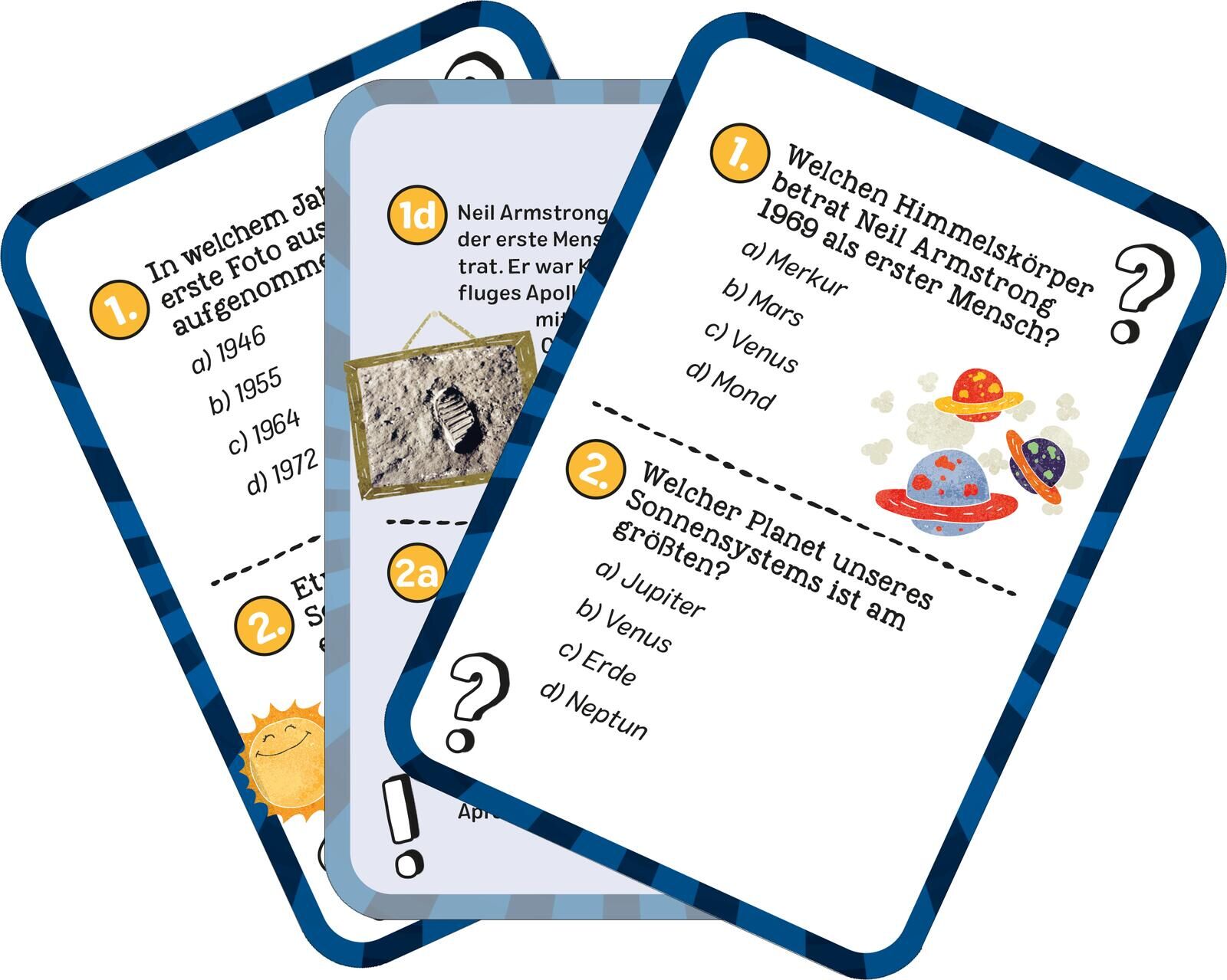Teste dein Wissen Mit vielen informativen Rätseln zum Weltraum auf 50 bunt illustrierten Quizkarten: Wie viele Planeten kreisen um die Sonne? Was sieht man am Nachthimmel, wenn Neumond ist? Wann wurde das erste Foto aus dem Weltall aufgenommen? Was müssen Ast...