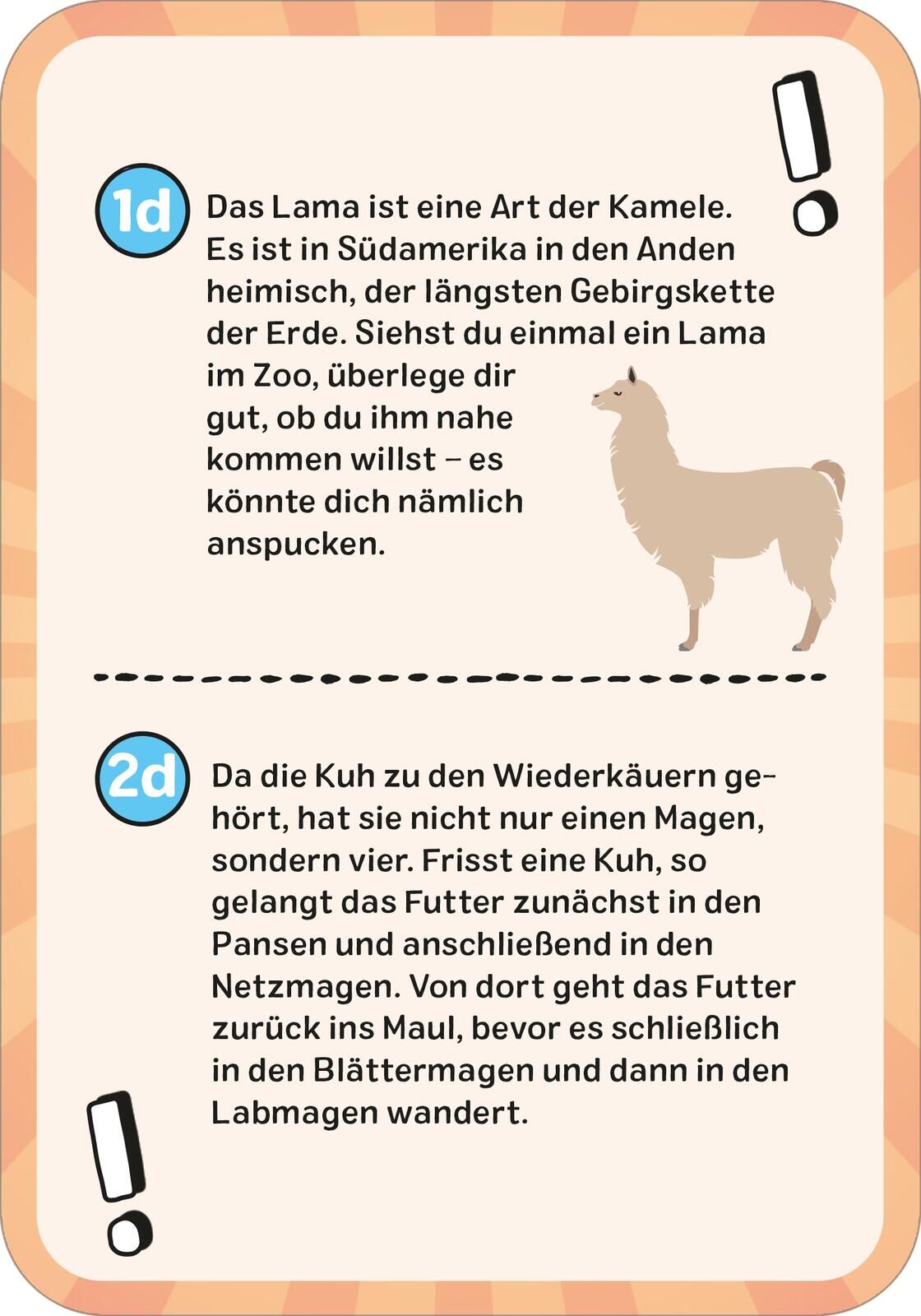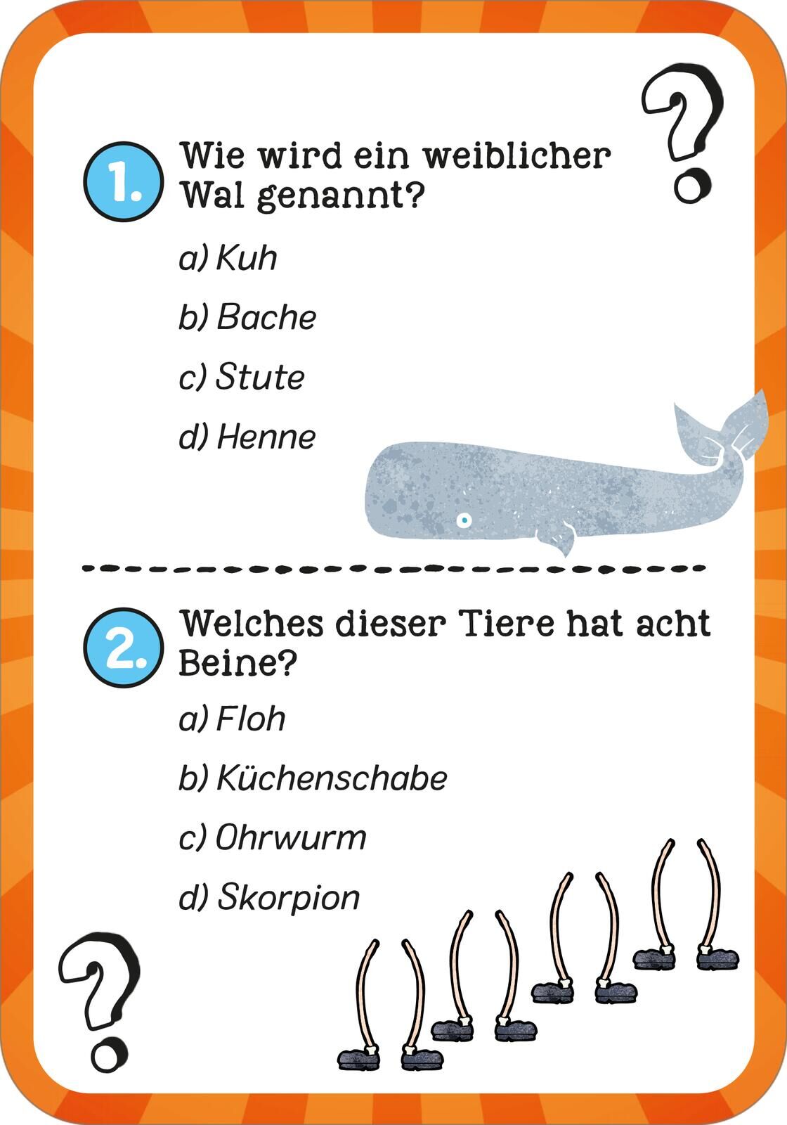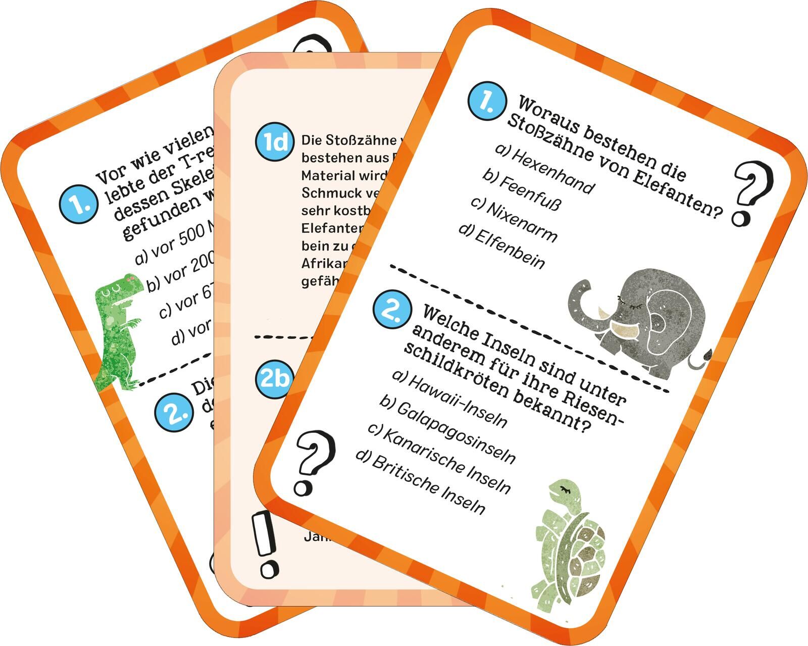 Teste dein Wissen Mit vielen informativen Rätseln zur Tierwelt auf 50 bunt illustrierten Quizkarten: Wie viele Halswirbel hat eine Giraffe? Was für ein Tier ist der Ziegenmelker? Wie schwer konnte ein Brontosaurus werden? Wo gibt es die meisten Tiger? Dieses ...