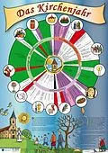 Das Plakat erläutert den Ablauf des Kirchenjahres nach christlicher Tradition. Die liturgischen Farben zeigen anschaulich den Wechsel zwischen Festvorbereitung, Festzeiten und festfreien Zeiten. Dabei berücksichtigt der Doppelkreis die Unterschiede zwischen de...