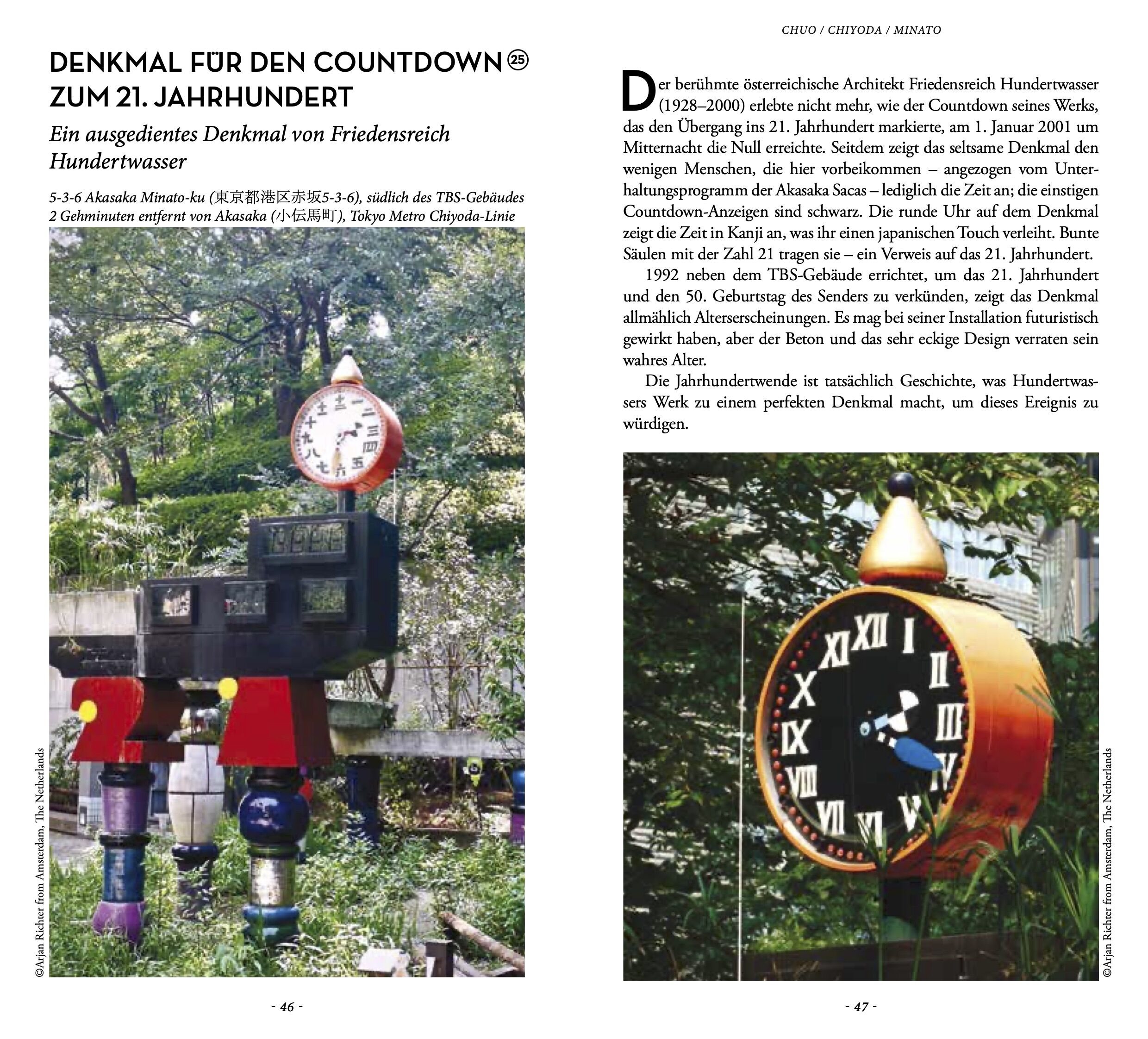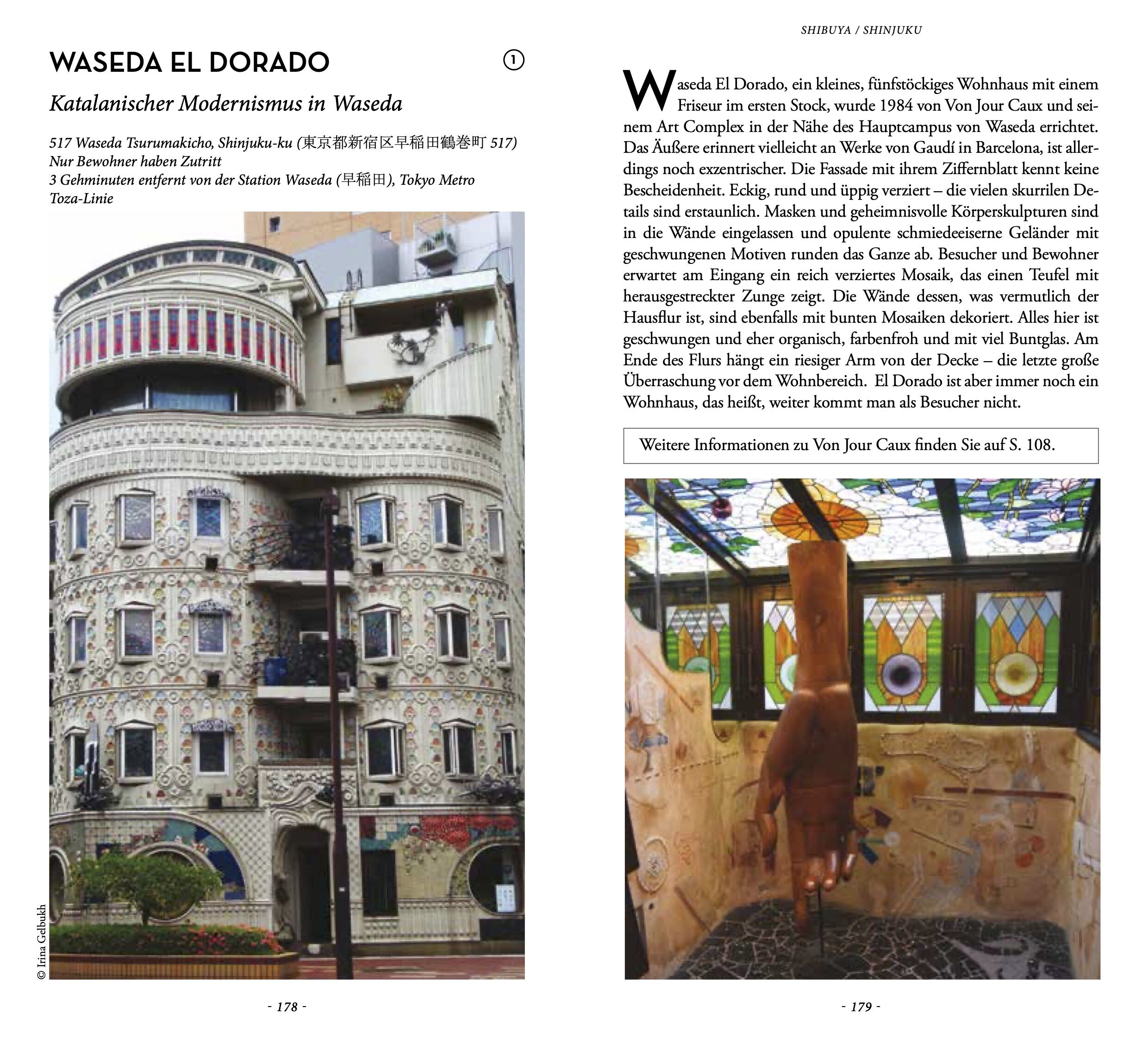 ** Ein Park, der nur per Aufzug zu erreichen ist, ein Canyon mitten in der Stadt, eine Statue gegen Warzen, öffentliche Designer-Toiletten , ein Park für weltweit einzigartige Sportarten, ein außergewöhnlicher Baum, der einem hilft, mit dem Rauchen aufzuhören, eine elektronische Sonnenblume, ein imposanter moderner Tempel im Herzen von Shinjuku, eine Straße, die Tokioter Taxifahrern Albträume beschert, ein riesiges Gebäude in Form eines Kriegsschiffs, verborgene Wasserläufe, ein Park für Philosophen , ein Park für neue Sportarten, ein Stadion, in das Krabben einliefen, ein geheimer Ort, um die Kirschblüte zu bewundern** , ein Gebäude wie ein Science-Fiction-Kampfroboter, Stelen zum Gedenken an jene, die ihre Körper für die Wissenschaft sezieren ließen, ein Bauernhof in einem Bürohaus, die exzentrische Architektur des Gaudí von Tokio ...