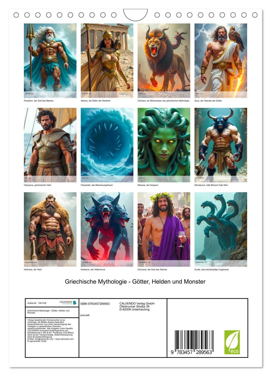 Der Kalender entführt in die Welt der griechischen Mythologie und zeigt eindrucksvolle KI Bilder legendärer Götter, mutiger Helden und gewaltiger Monster. Jede Seite fängt die epische Atmosphäre antiker Mythen ein von den göttlichen Hallen des Olymps bis zu de...