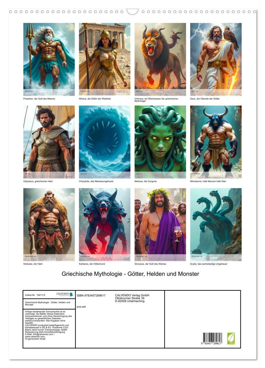 Der Kalender entführt in die Welt der griechischen Mythologie und zeigt eindrucksvolle KI Bilder legendärer Götter, mutiger Helden und gewaltiger Monster. Jede Seite fängt die epische Atmosphäre antiker Mythen ein von den göttlichen Hallen des Olymps bis zu de...