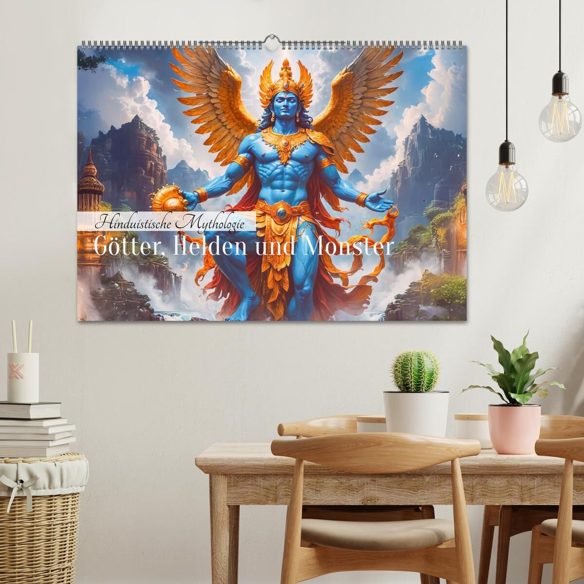 Ein kunstvoll gestalteter KI Wandkalender, der jeden Monat eine kraftvolle Szene aus der hinduistischen Mythologie zeigt von Göttern, Dämonen bis zu mythischen Schlangen in detailreichen, bildgewaltigen Illustrationen.