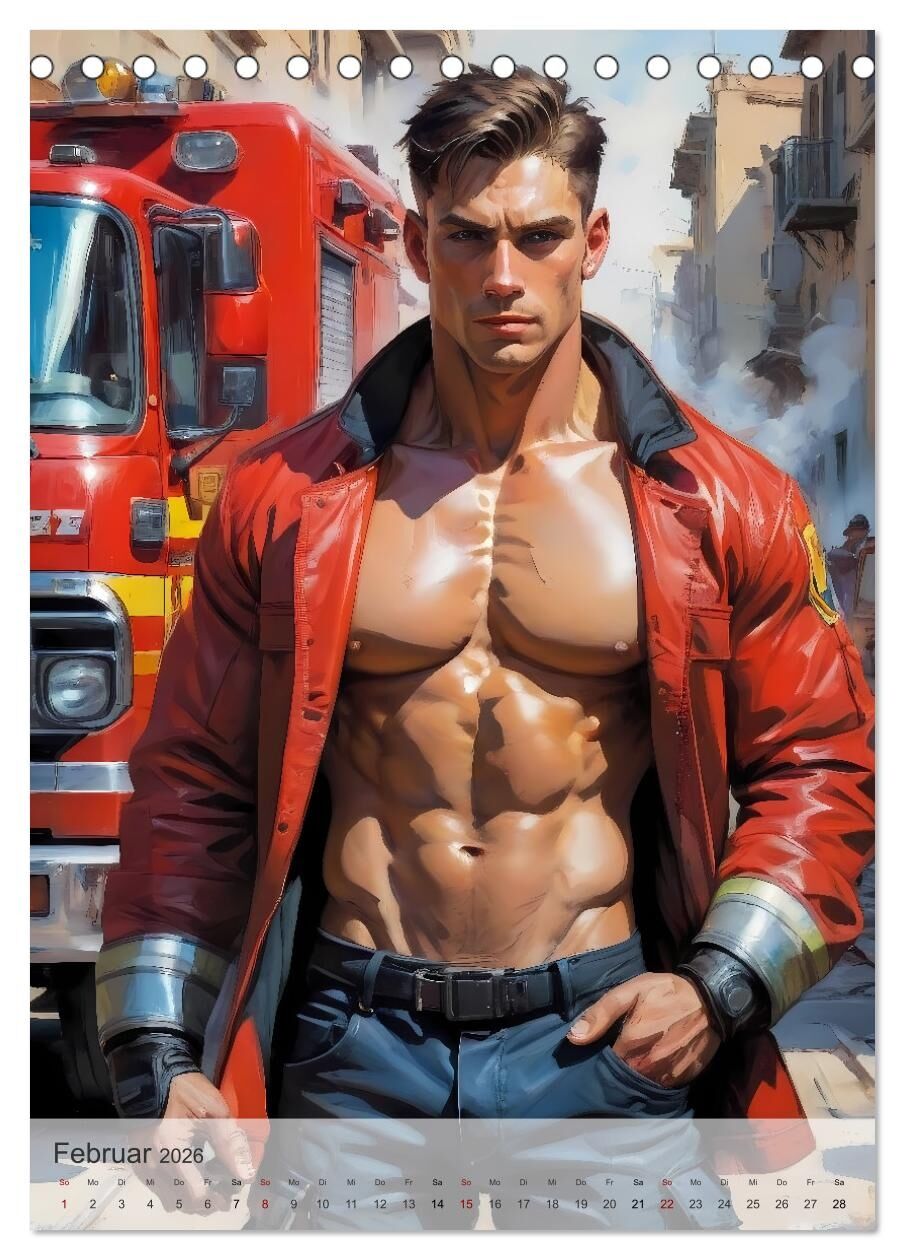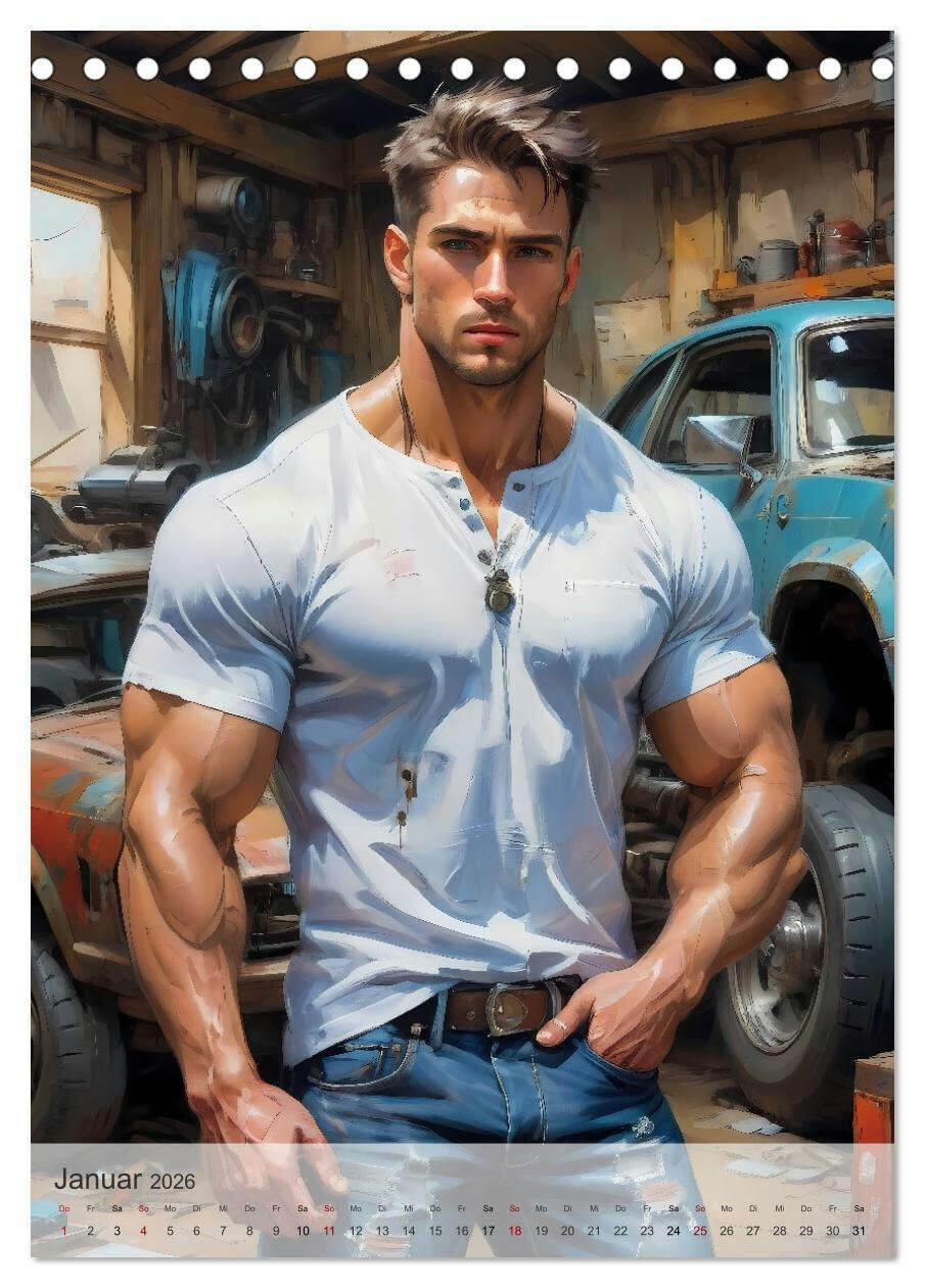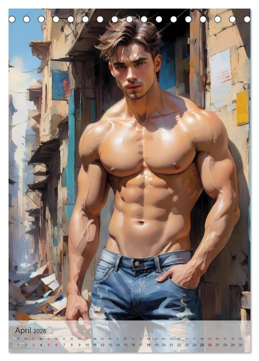 Der Kalender präsentiert beeindruckende Illustrationen von durchtrainierten, attraktiven Männern in verschiedenen, stilvoll illustrierten Szenerien, die Eleganz und Stärke ausstrahlen. Jede Seite fängt die ästhetischen Körperformen und charismatischen Posen de...