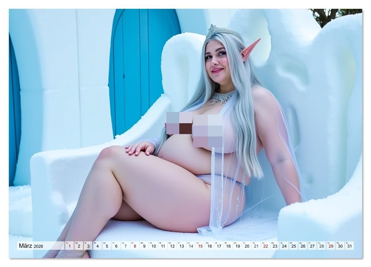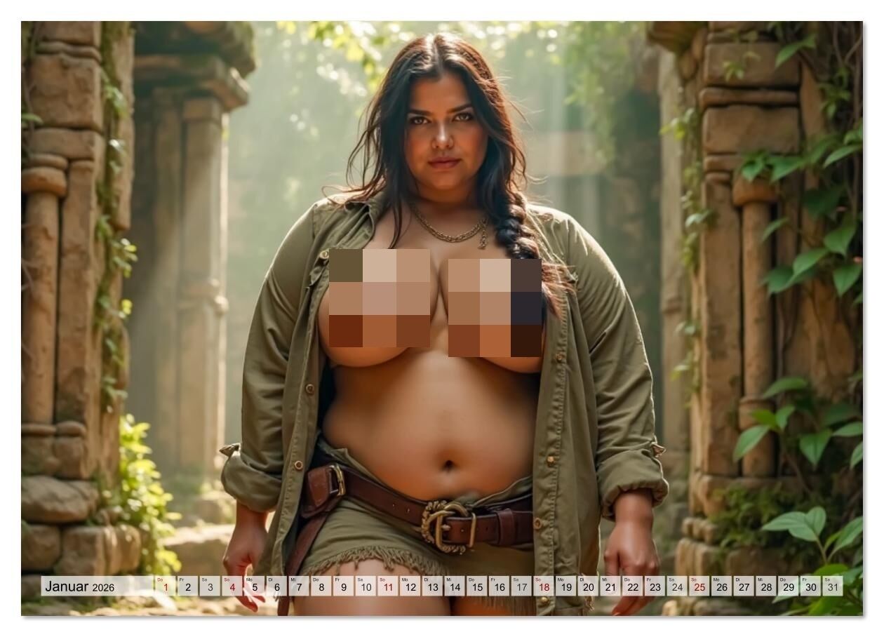 Ein heißer Cosplay-KI-Kalender mit sinnlichen Plus-Size-Damen, die in freizügigen Kostümen und verführerischen Posen ihre kurvige, nackte Haut selbstbewusst in Szene setzen.