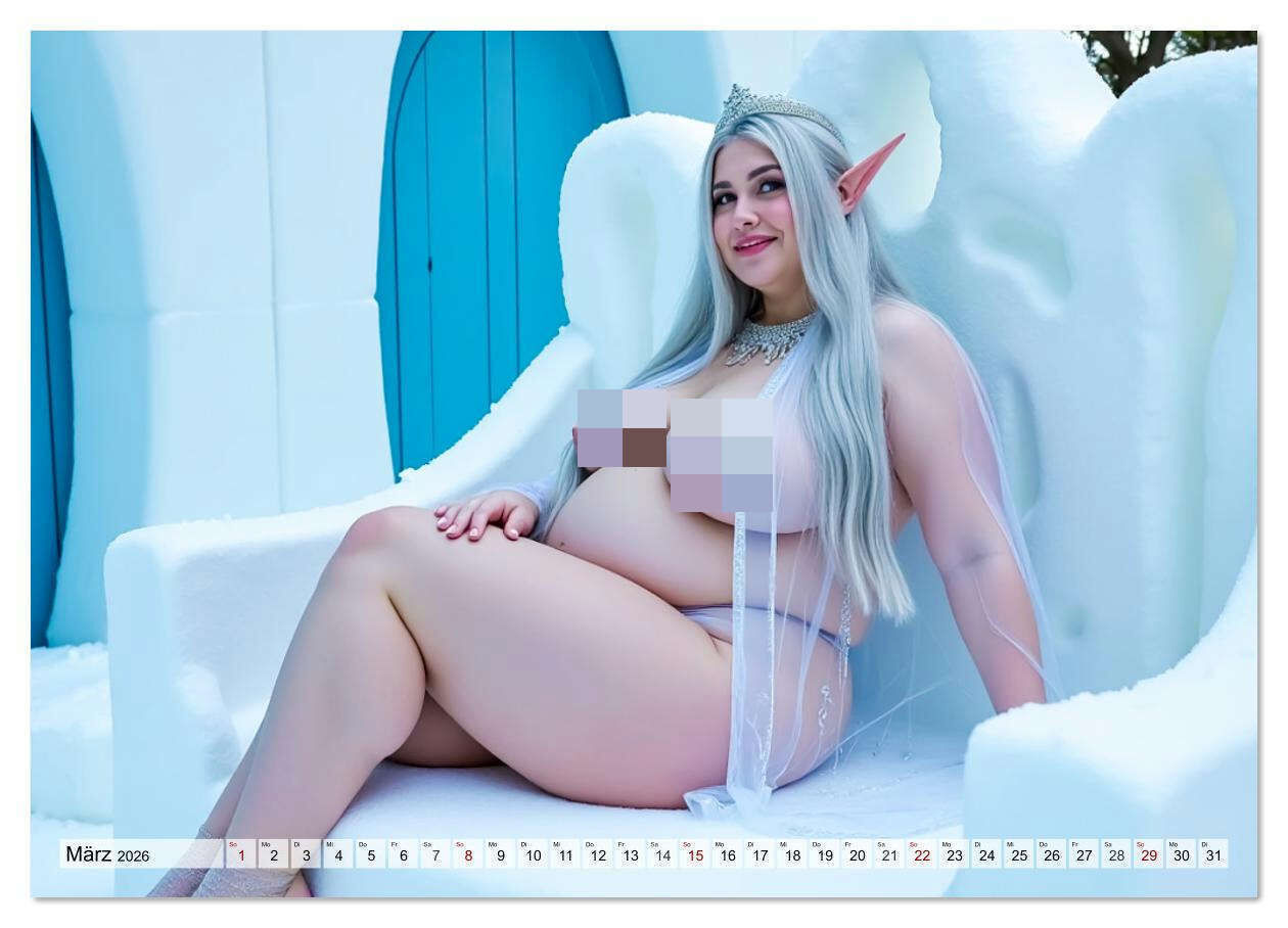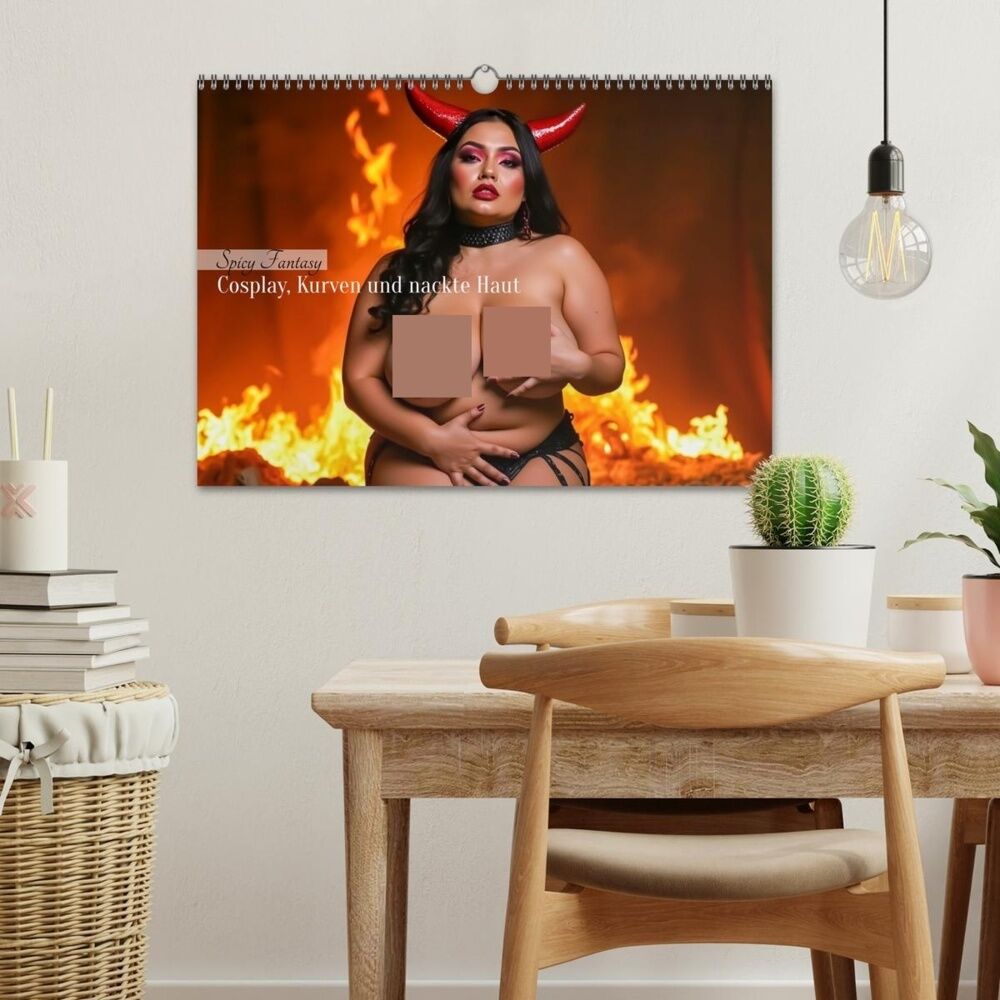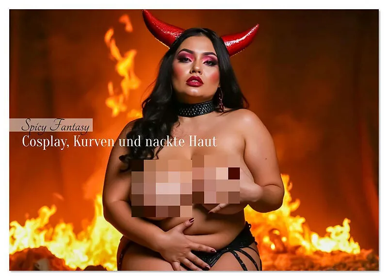 Ein heißer Cosplay-KI-Kalender mit sinnlichen Plus-Size-Damen, die in freizügigen Kostümen und verführerischen Posen ihre kurvige, nackte Haut selbstbewusst in Szene setzen.