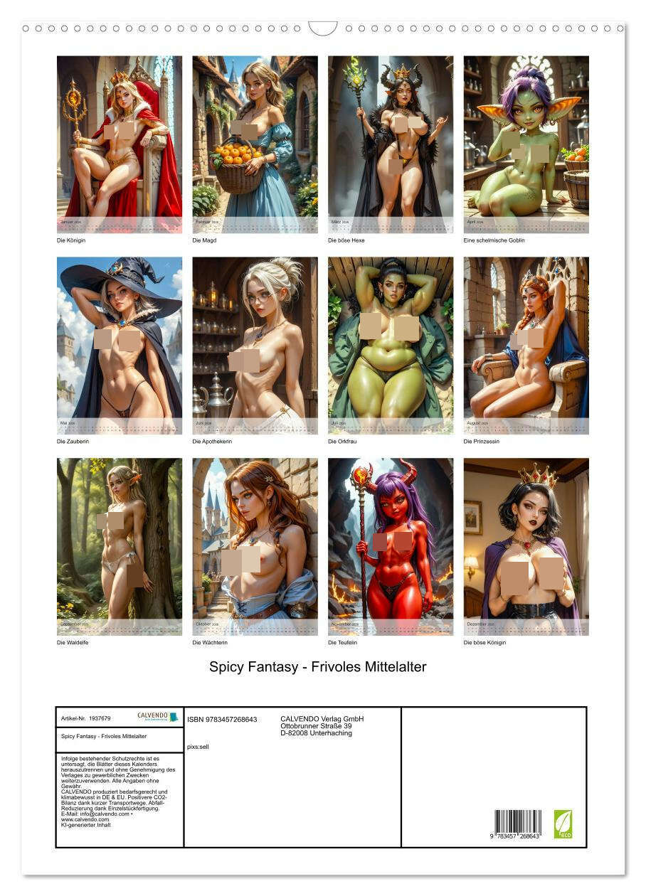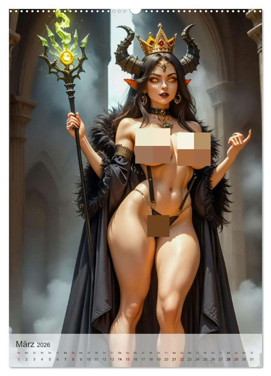 Ein aufregender KI-Kalender, der sinnliche Fantasy-Frauen im mittelalterlichen Stil zeigt mächtige Kriegerinnen, verführerische Zauberinnen und mystische Königinnen, kunstvoll inszeniert zwischen Rüstung, Magie und Leidenschaft.
