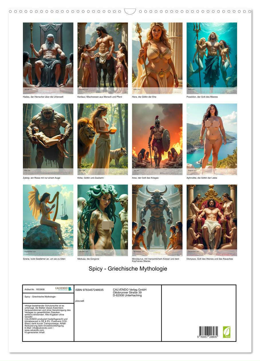 Der KI- Kalender zeigt Götter und Monster der griechischen Mythologie in sinnlichen, ästhetischen Darstellungen mit freizügigen Posen und kunstvollen Hintergründen, die ihre Macht und Erotik betonen.