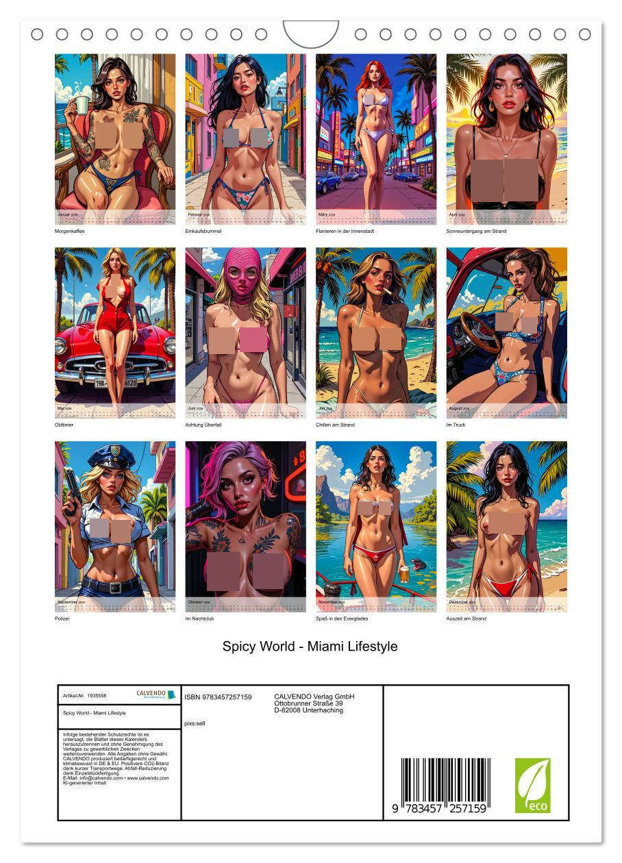 Der heiße Comic-KI-Kalender inszeniert sexy, klischeehaften Miami-Vibes durch Bikini-Babes, Neonlichter, Stränden und heiße Nächte, stilvoll, erotisch und verführerisch inszeniert.