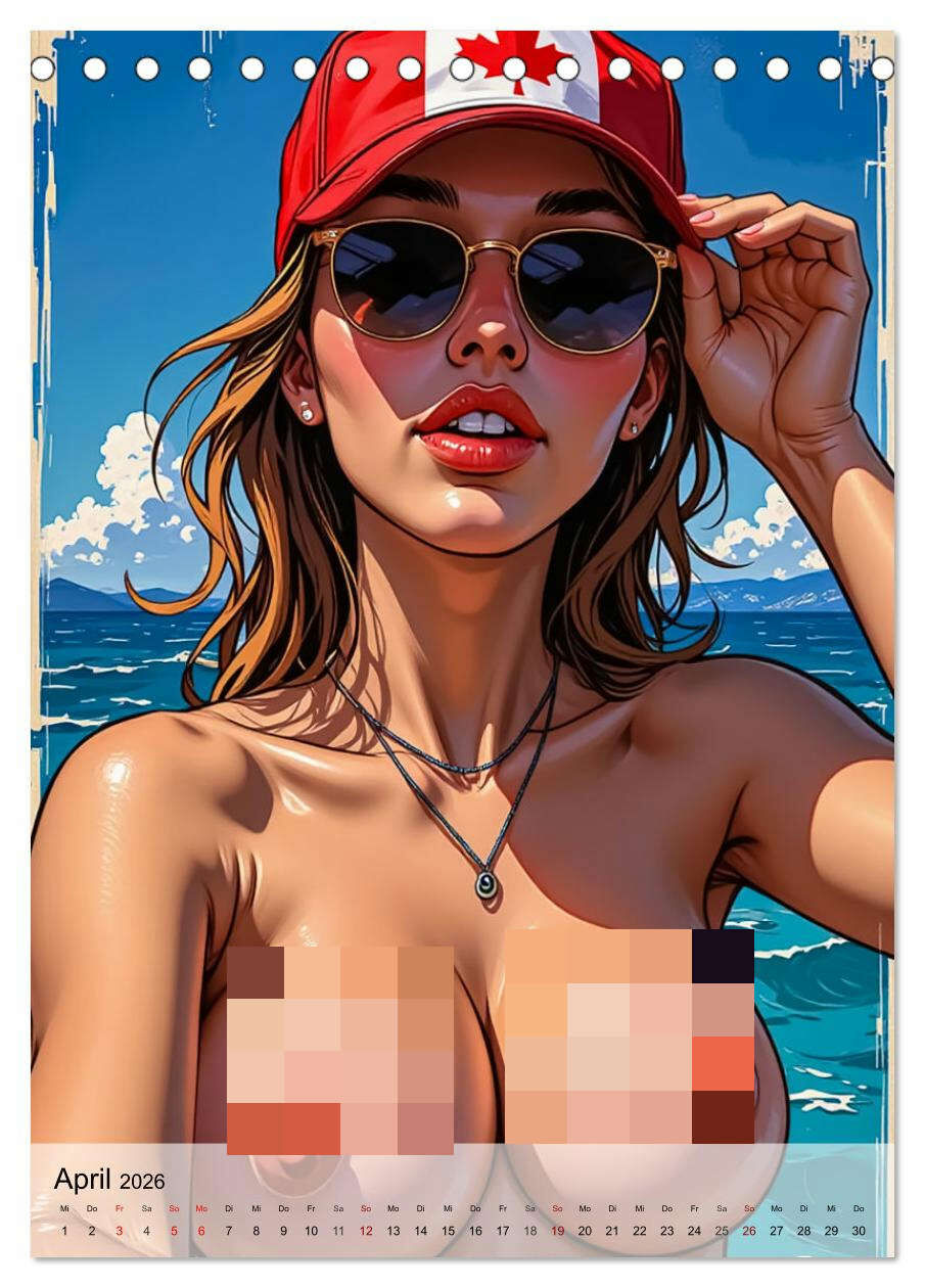 Ein stilvoller Kalender mit humorvollen, nackten Comic-Zeichnungen schöner Kanadierinnen, die mit typischen Klischees wie Ahornsirup, Eishockey und Holzfäller-Romantik vor ikonischen Orten wie den Rocky Mountains oder Toronto inszeniert sind.