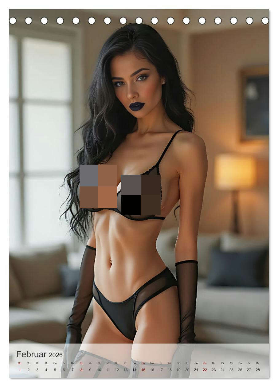 Ein heißer KI-Kalender, der verführerische Goth-Girls mit schwarzen Haaren, dunklen Lippen und sexy Kurven in mystischen, sinnlichen Posen zeigt pure dunkle Versuchung.