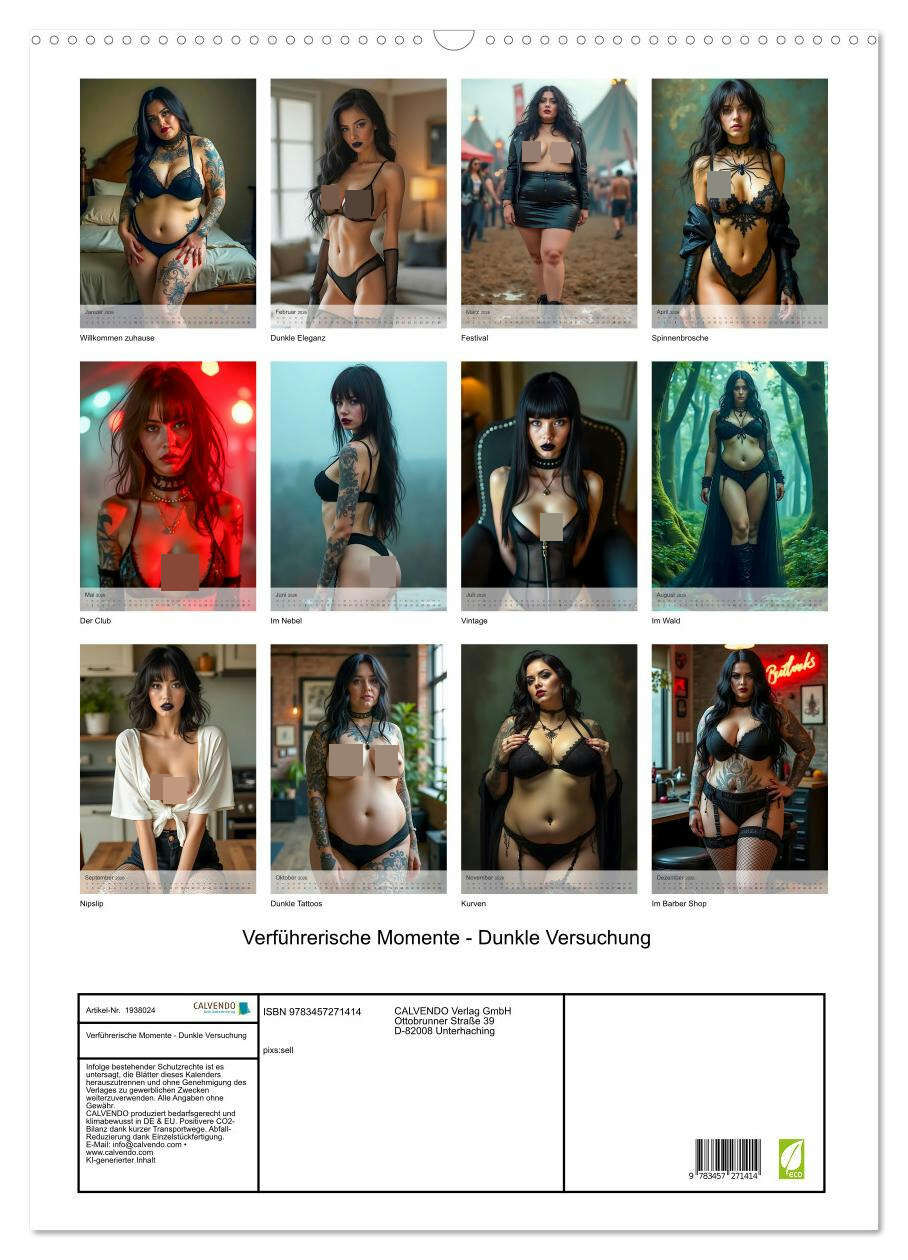 Ein heißer KI-Kalender, der verführerische Goth-Girls mit schwarzen Haaren, dunklen Lippen und sexy Kurven in mystischen, sinnlichen Posen zeigt pure dunkle Versuchung.