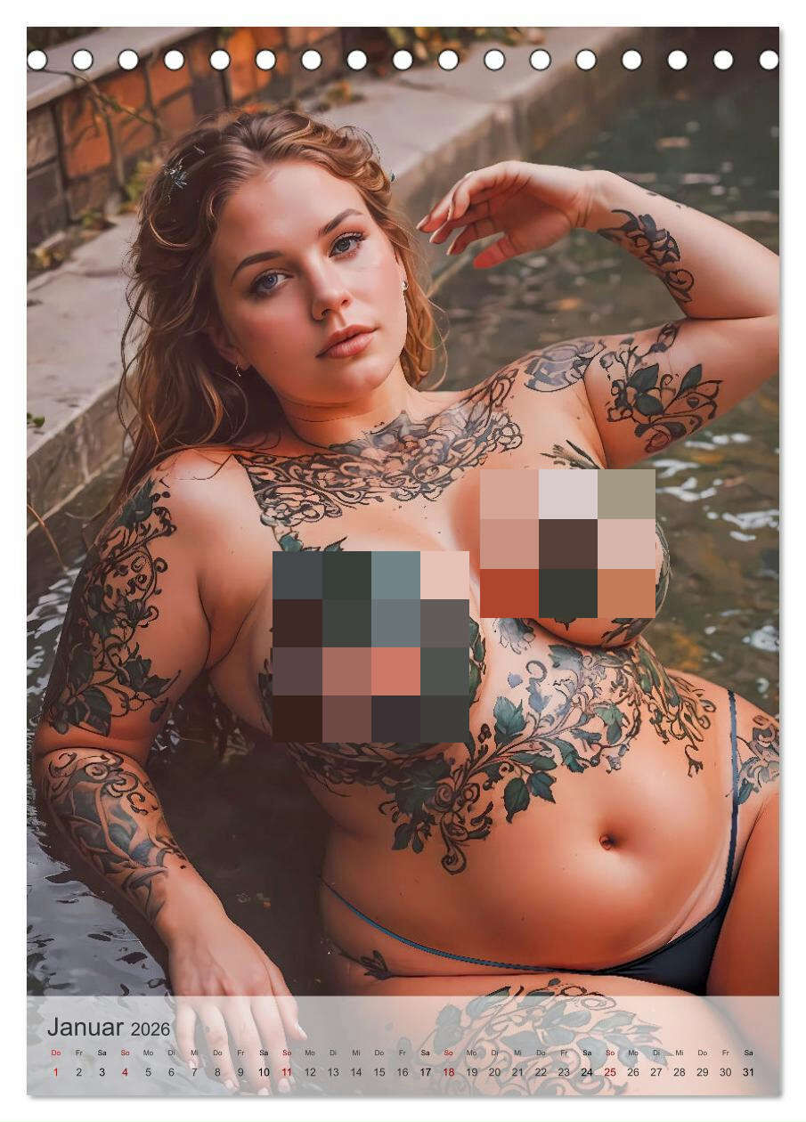 Dieser KI Kalender rückt kurvige Frauen mit beeindruckenden Tattoos in den Fokus, die in anspruchsvollen und kunstvollen Posen inszeniert werden. Jede Seite zelebriert die Verbindung von Körpervielfalt, Tattoo-Kunst und der Eleganz dynamischer Körperhaltung.