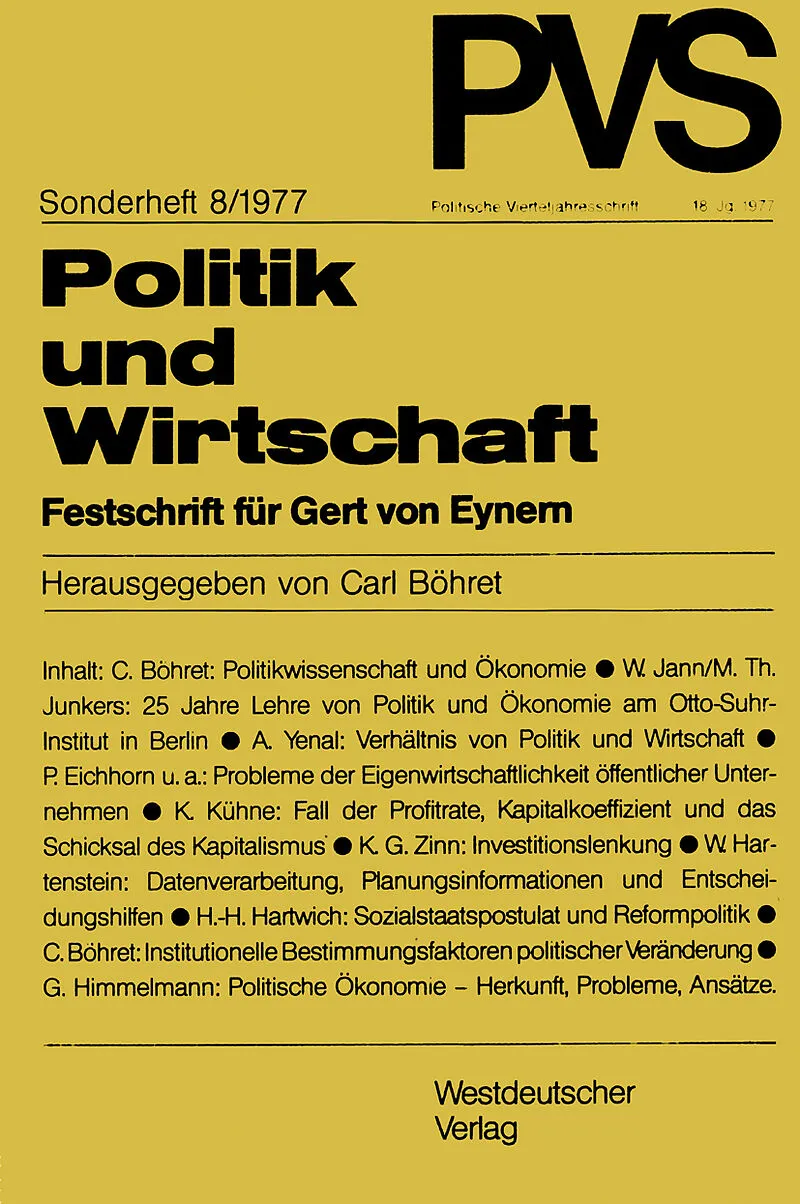 Interdependenzen von Politik und Wirtschaft. Beitrage zur Politischen Wirtschaftslehre. Fest gabe fUr Gert von Eynern, h rsg. von Carl Babret und Dieter Grosser, Berlin 1967 (638 S.). Vgl. ferner tiber Gert von Eynern: Die Hochschullehrer der Wirtschaftswissen...